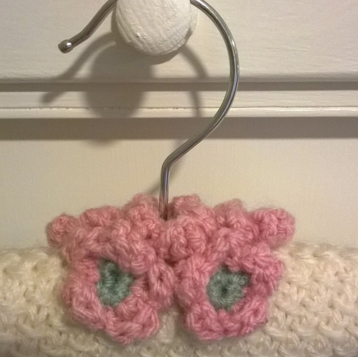 A hand knitted and padded ladies coat hanger. The wooden base is wrapped in wadding and topped in a delicate cream textured stitch cover. The metal hook is surrounded with 6 pink daintily crocheted apple blossom flowers.