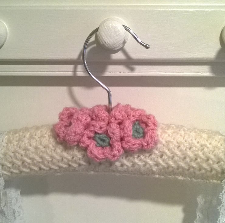 A hand knitted and padded ladies coat hanger. The wooden base is wrapped in wadding and topped in a delicate cream textured stitch cover. The metal hook is surrounded with 6 pink daintily crocheted apple blossom flowers.