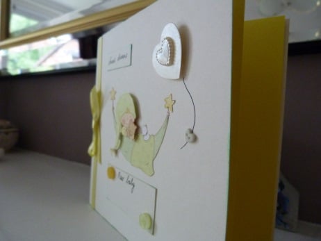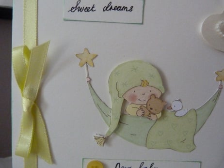 A completely handmade card consisting of a decoupaged design of a cute new baby in a hammock made from the moon and suspended by stars. Mounted onto quality cream card with a sweet dreams tag and a tag with new baby with space for the new baby's name. Finished off with a heart shaped ballon with pearlised heart, baby buttons and a lemon ribbon and bow