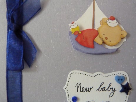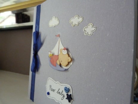 A completely handmade card consisting of a cute little decoupaged baby boy asleep on a yacht. Mounted onto quality wedgewood blue/white flecked card. Finished off with little fluffy clouds, new baby tag and royal blue organza ribbon and bow