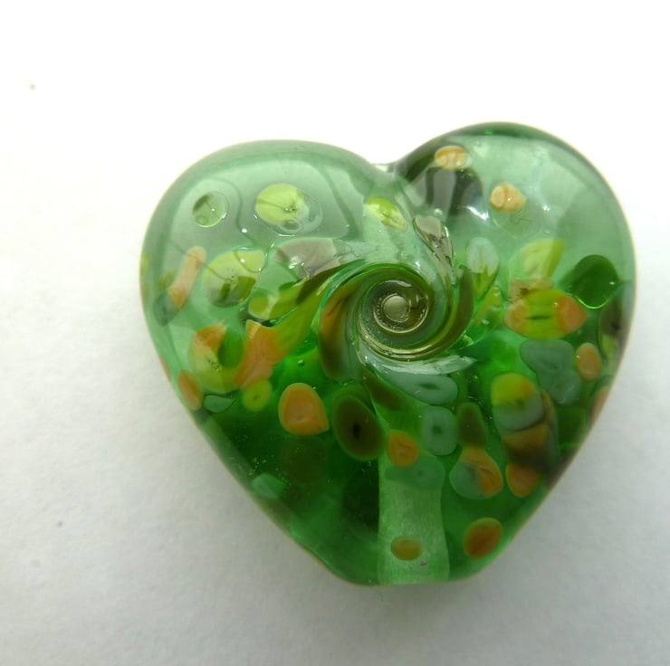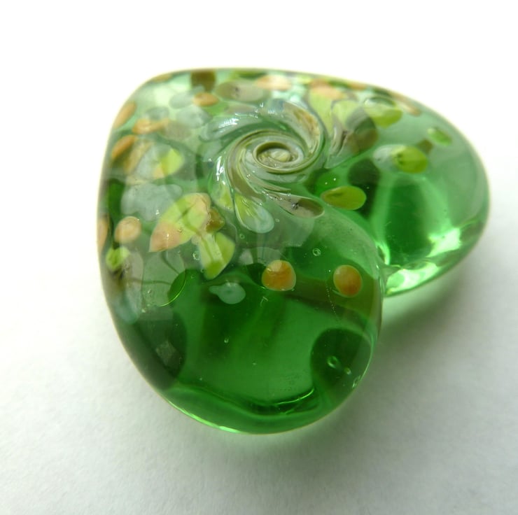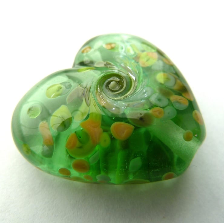 A handmade lampwork glass focal bead which has been made with green glass, rolled in frit and shaped into a heart using a brass press.