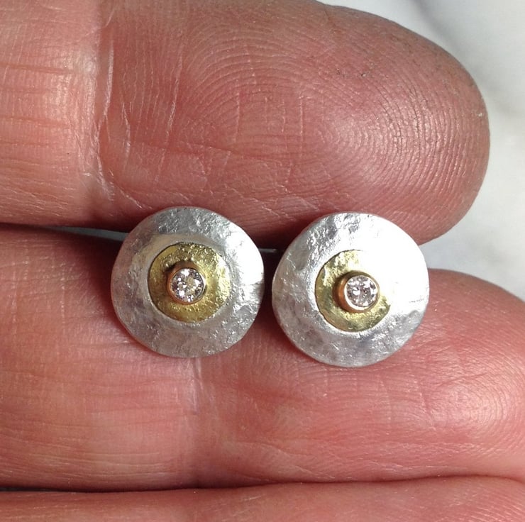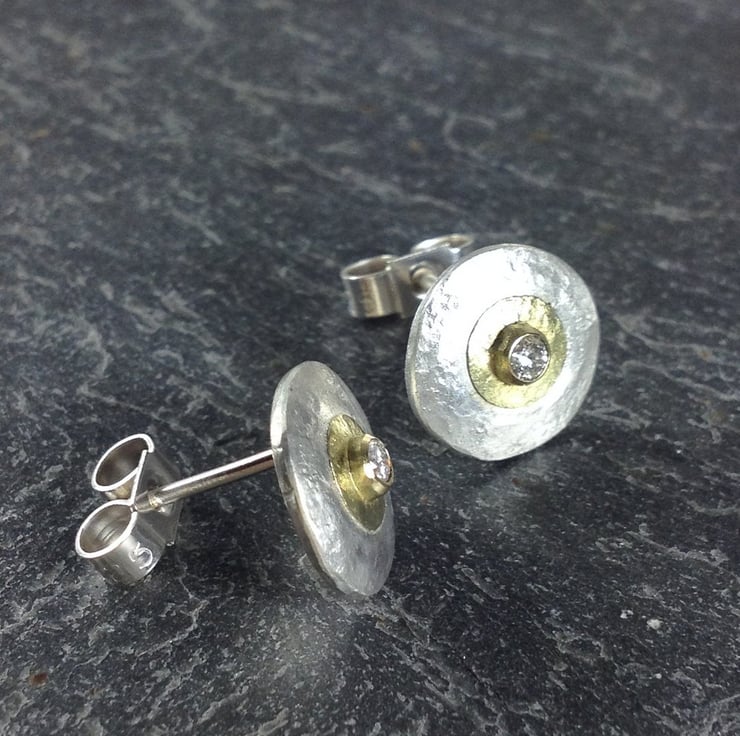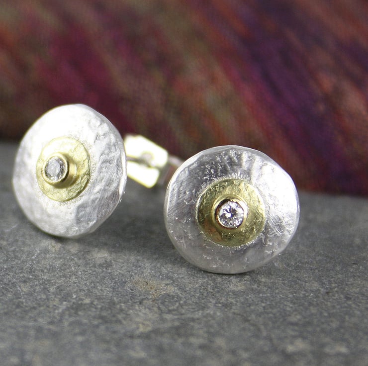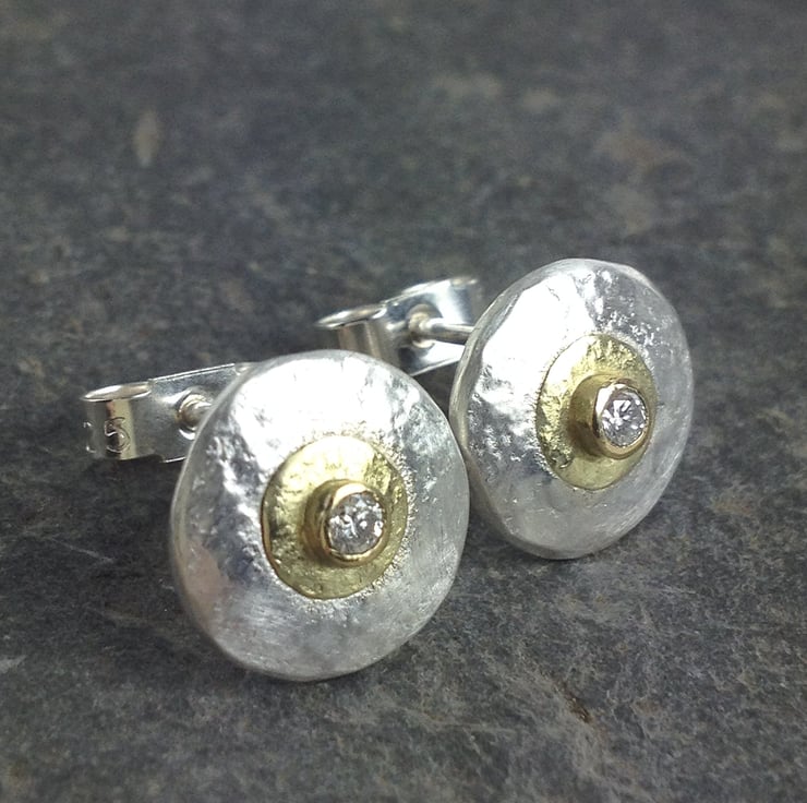 These little earrings have been cut from thick sterling sheet and hammered for shape and texture , they feature a small disk and setting in 18ct yellow gold and are set with sparkly little round brilliant cut diamonds .