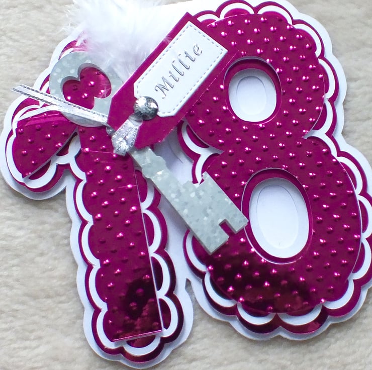 This vibrant, die-cut 18th birthday number card is approx. 6"x 6” in size. The 3D layers are made from fuchsia mirri and centura pearl card stock. The card has been embellished with a silver personalised key, with marabou feather. Includes the sentiment, ‘Happy Birthday’, inside.