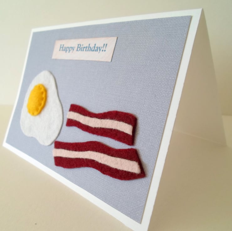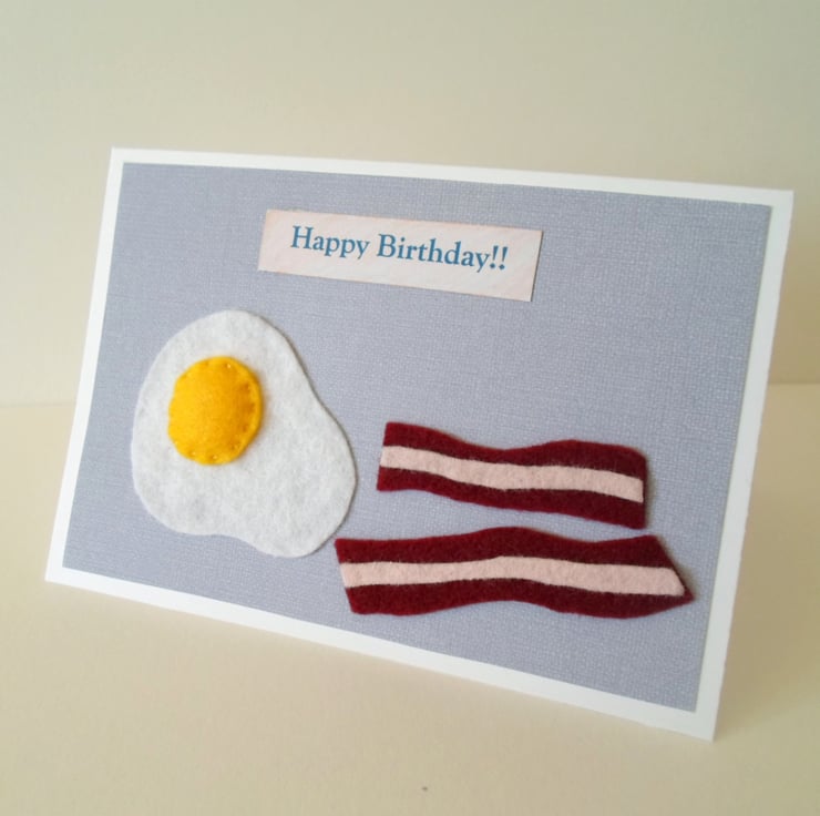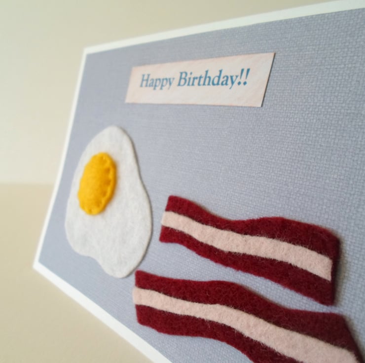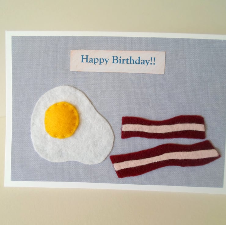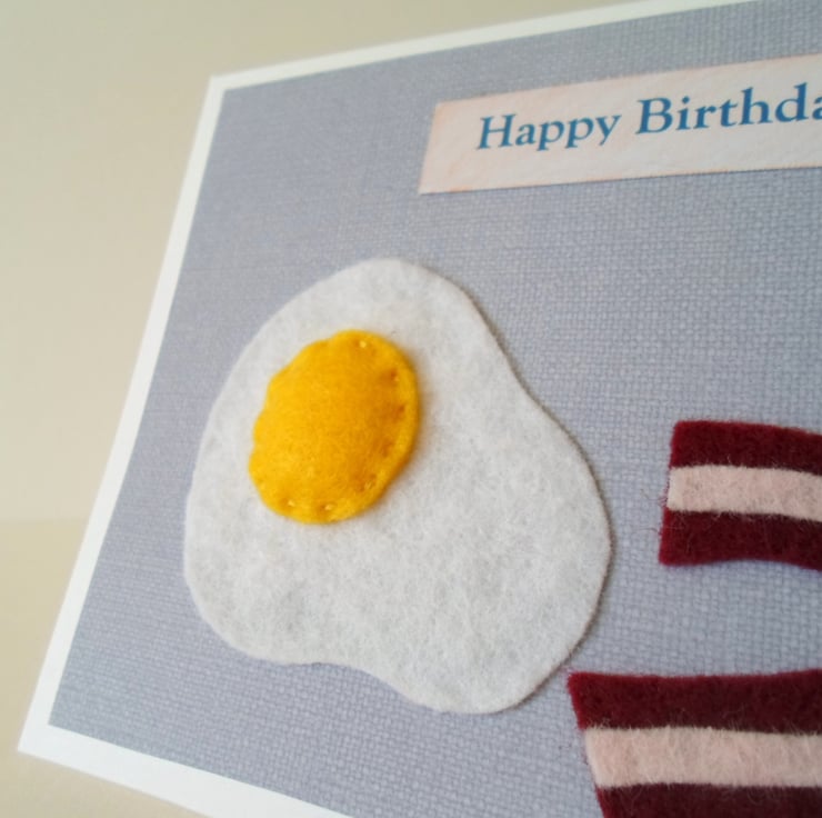 Birthday Card. Hand sewn bacon and eggs in felt on grey textured card. Measures 15.5 cm x 11 cm (6'' x 4.2''). Blank inside for your own message. White envelope included.