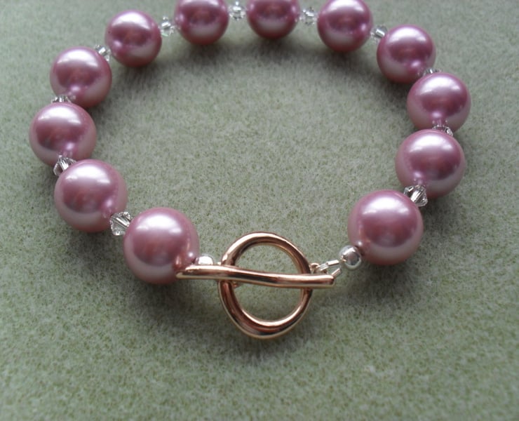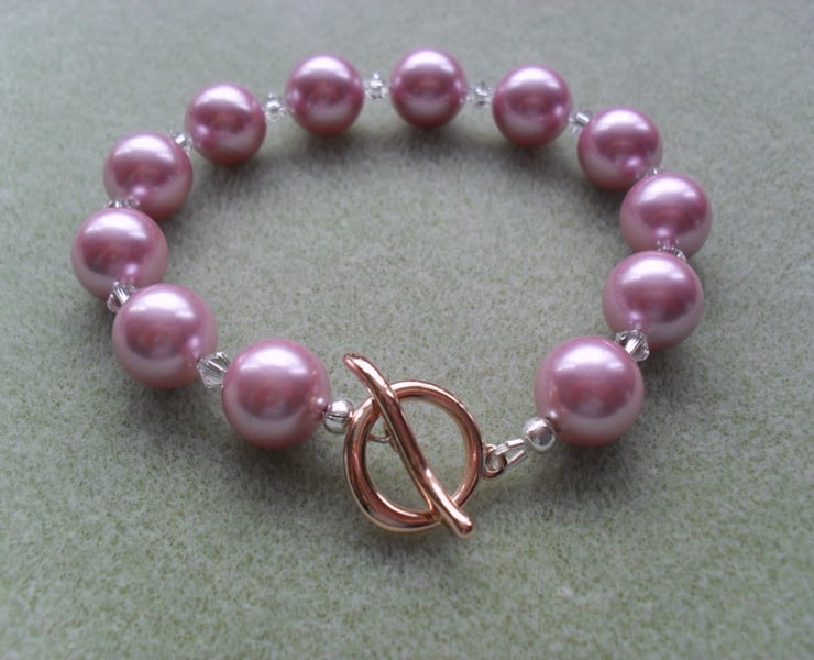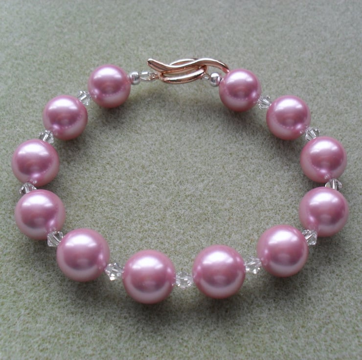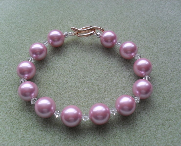 Shell pearl and Swarovski crystals are beaded with a beading wire and attached to a rose gold plated zamak toggle clasp which is a good quality clasp.