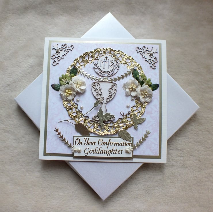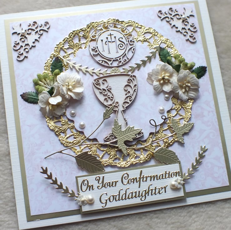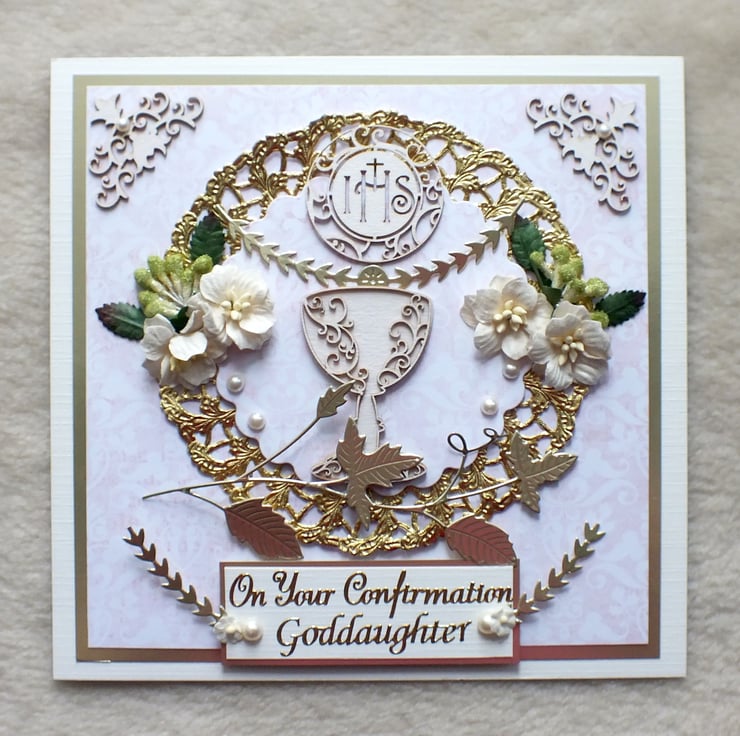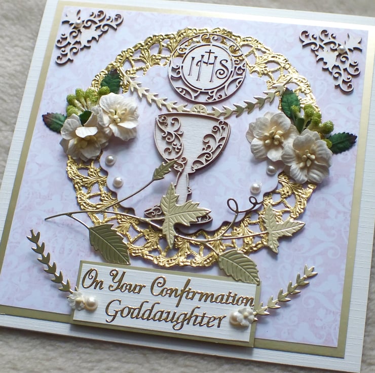 This luxury handmade Confirmation card is approx. 7”x 7” in size, created using cream linen card stock, gold mirri and pink patterned card, embellished with the Holy Sacrament and Chalice, flowers, faux pearls, gold vine leaves and doily. Includes the sentiment ‘Congratulations On Your Confirmation’ inside.