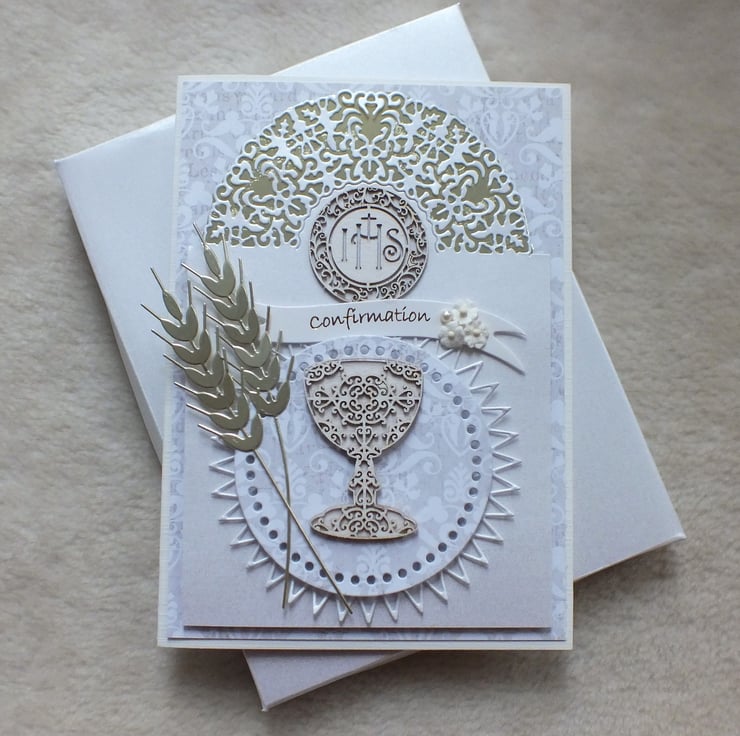 This luxury handmade Confirmation card is approx. 7”x 5” in size, created using cream linen and taupe patterned card stock. Embellished with the Holy Sacrament and Chalice, faux flowers, gold die-cut wheat, matted and layered onto lace effect die-cut, white pearlescent and gold mirri card. Includes the sentiment ‘Congratulations On Your Confirmation’ inside.