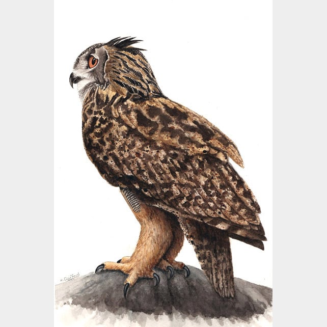 This is a unique original watercolour painting of a magnificent eagle owl standing on an outcrop with his bright orange eyes staring out into the distance. With feathers mottled in many shades of brown and grey, a curved sharp beak, long scimitar talons and powerful legs in feathered trousers, he is a truly splendid bird and a superbly designed hunter.