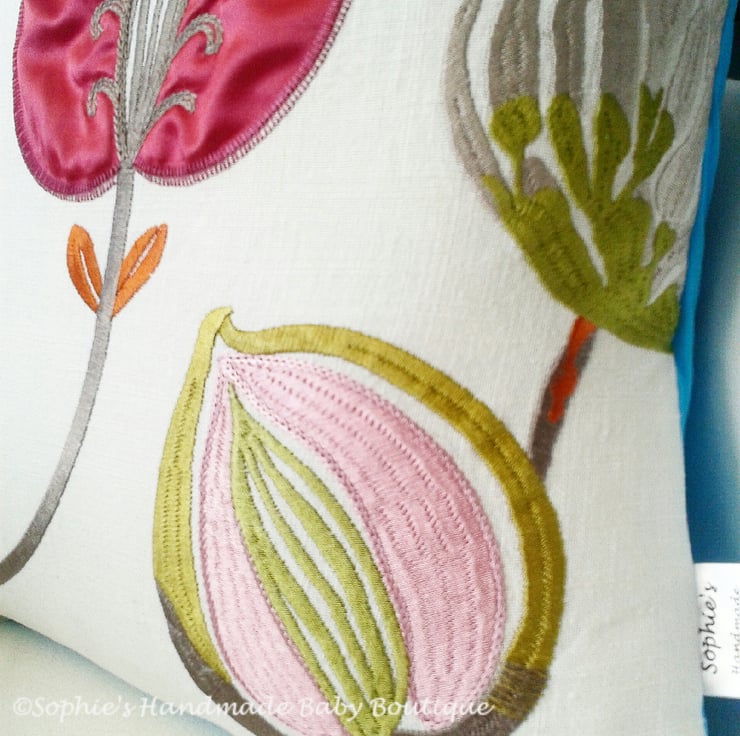 The embroidered pattern consists of pinks, greens, blue, silver and orange.
