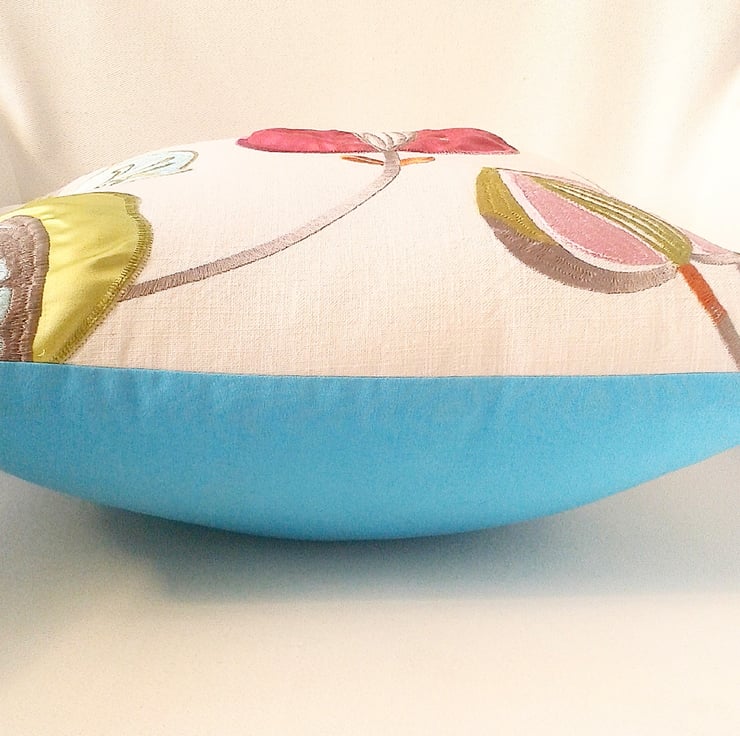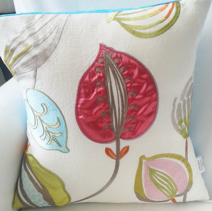 A stunning and stylish embroidered Harlequin fabric fronted cushion, mixed with silk florals, approximately 16 x 16 inches. The backing consists of striking turquoise cotton, with an envelope style opening.