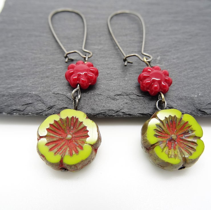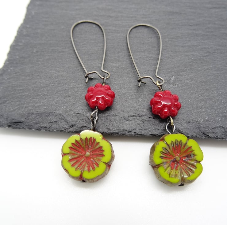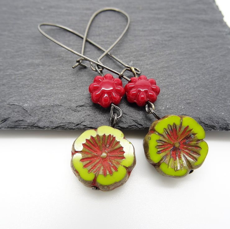 These are gorgeous earrings made with 13mm lime czech glass flowers which have a red middle with beautiful detail. These are teamed with red 8 mm daisies. The earrings hang from idney shaped gunmetal earwires. The earrings measure 6.5cm (2.1/2") from top of earwire. As all of the items in my shop are unique, individual pieces, these are the earrings you will receive. They will arrive gift wrapped in tissue paper and a organza bag.