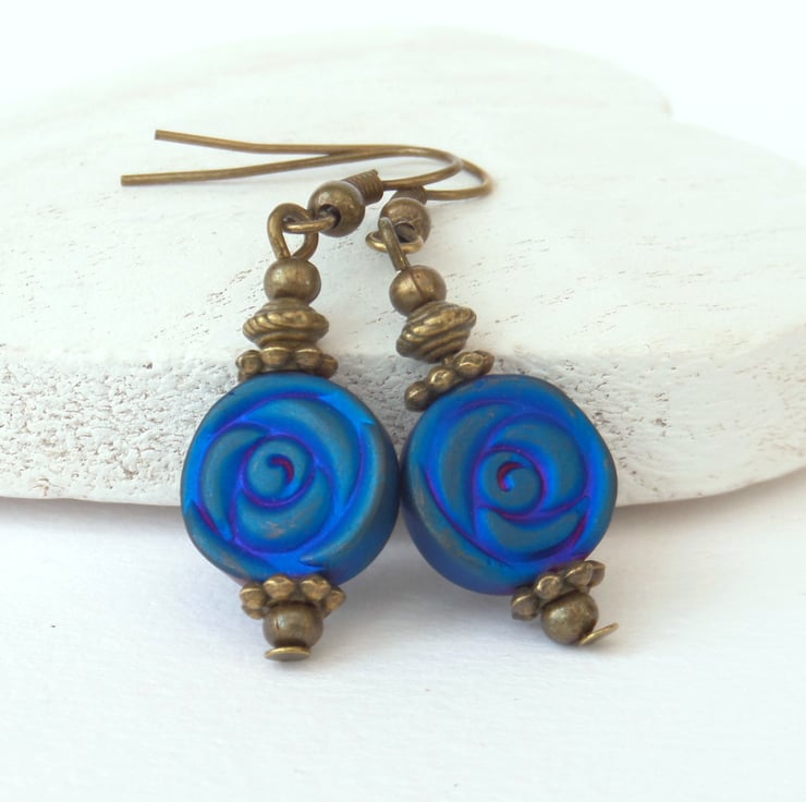 The coating on the hematite is pure blue on one side and two-tone, (blue & crimson pink) on the other, and looks gorgeous. The rosebud design adds to their beauty.