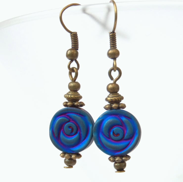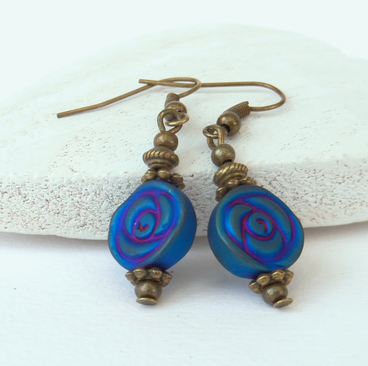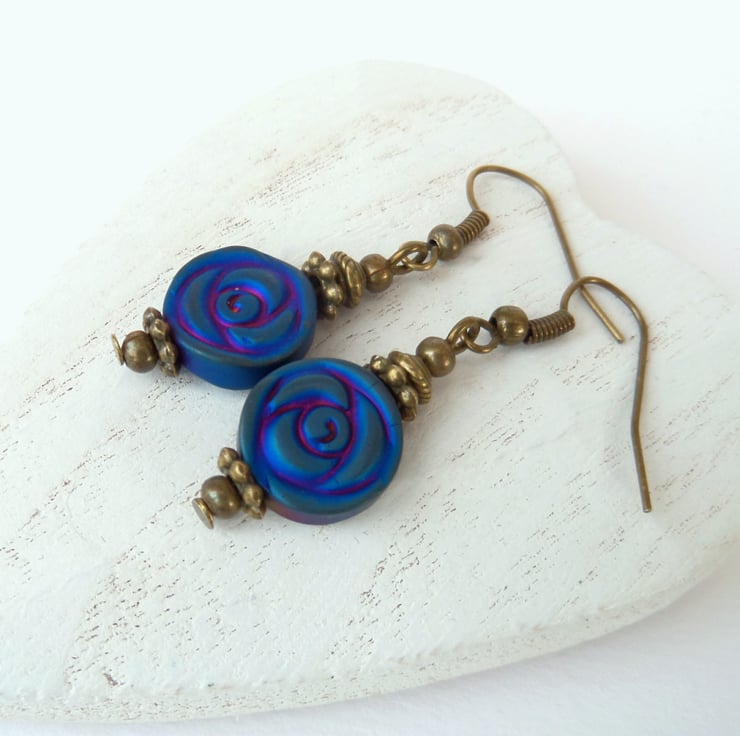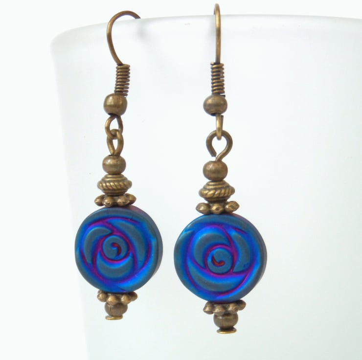 The coating on the hematite is pure blue on one side and two-tone, (blue & crimson pink) on the other, and looks gorgeous. The rosebud design adds to their beauty.