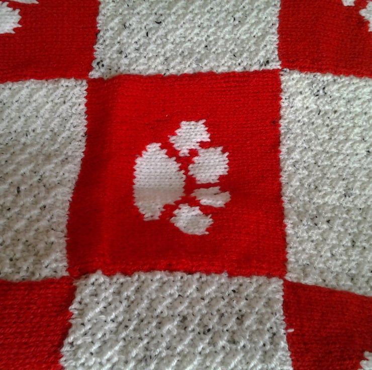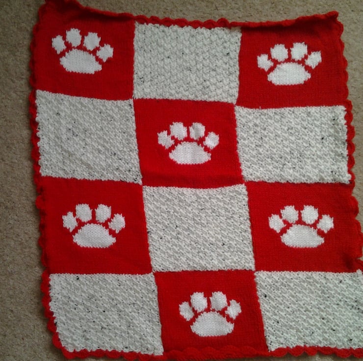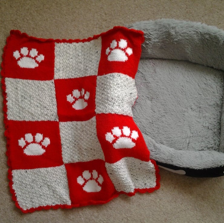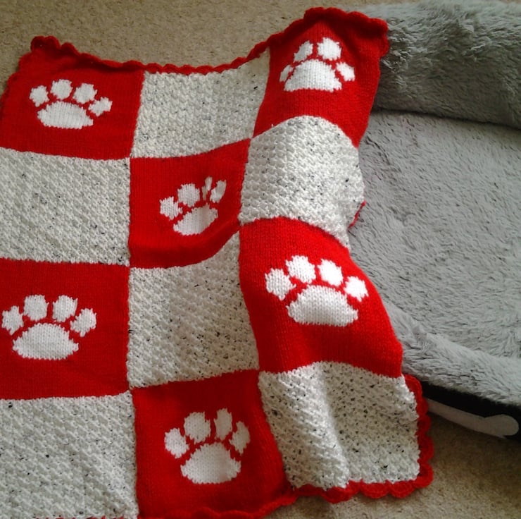 Made with pillar box red and soft white wool, with cute white paw prints sprinkled over the blanket.
