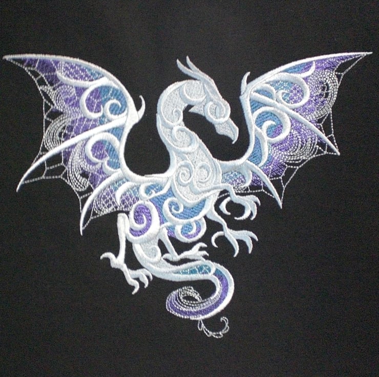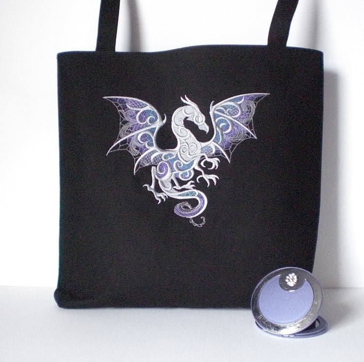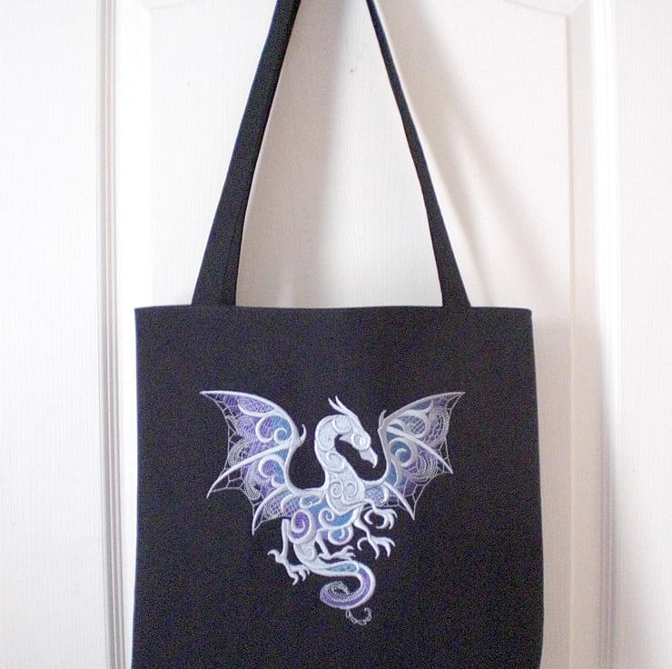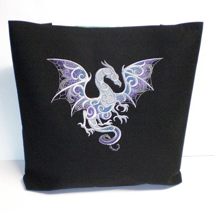 A medium sized tote bag made of black cotton drill fabric, embroidered with a stunning dragon in shades of silver grey, purple and jade green.