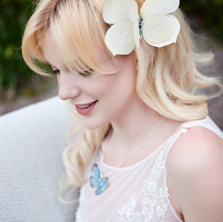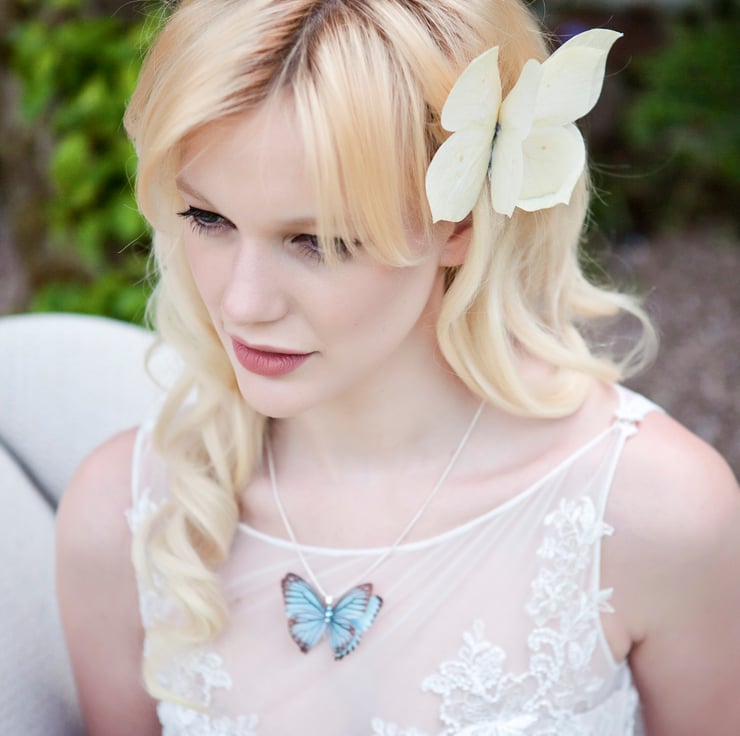 A delicate hand cut silk butterfly made from soft silk with a sheer duponi silk top layer that gently flutters as you move. In soft subtle pale blue shades.