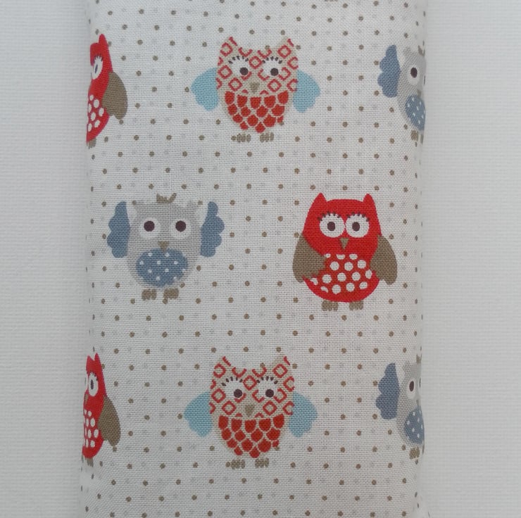 This sunglasses or glasses case has cute owls on a dotty background. It has a blue and red lining. It is lightly padded and has a white elastic loop and white button closure. The case measures approximately 17cm x 9cm.