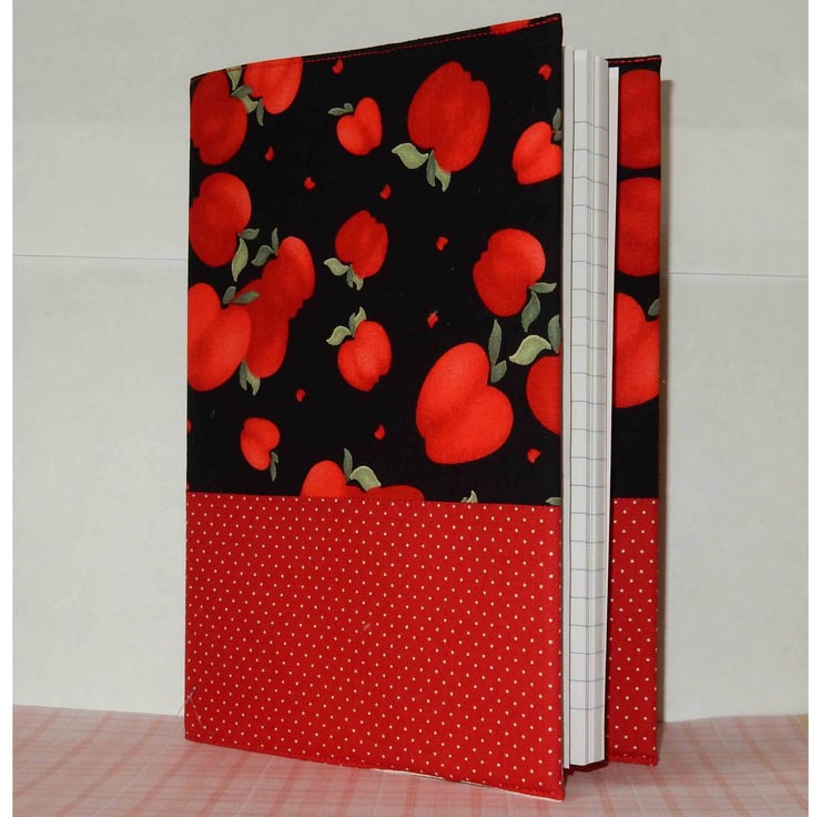 This is an A5 notebook, with lined paper,it has been covered with two fabrics, one featuring colourful apples, and the other a toning spot. It is interfaced and lined in plain fabric, the cover can be removed, and a replacement notebook fitted when needed.