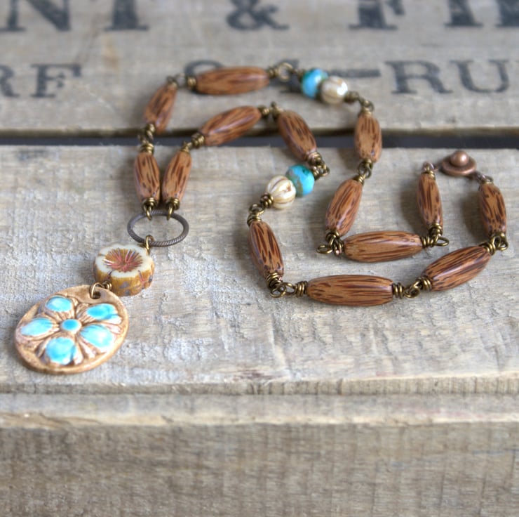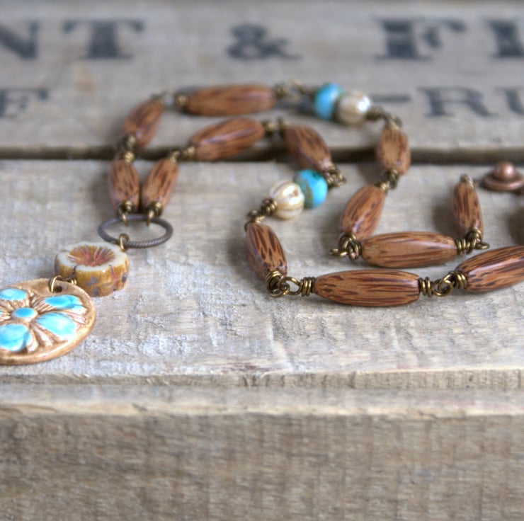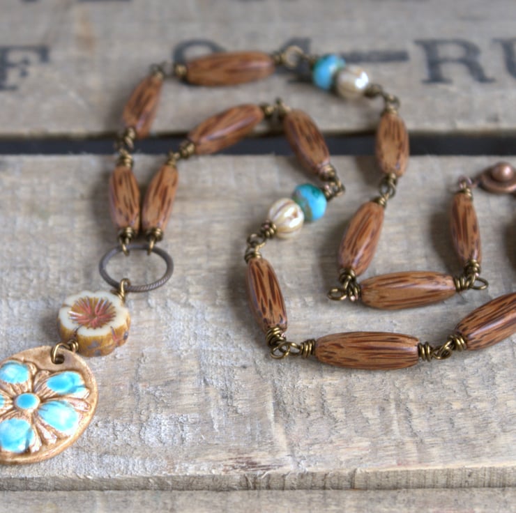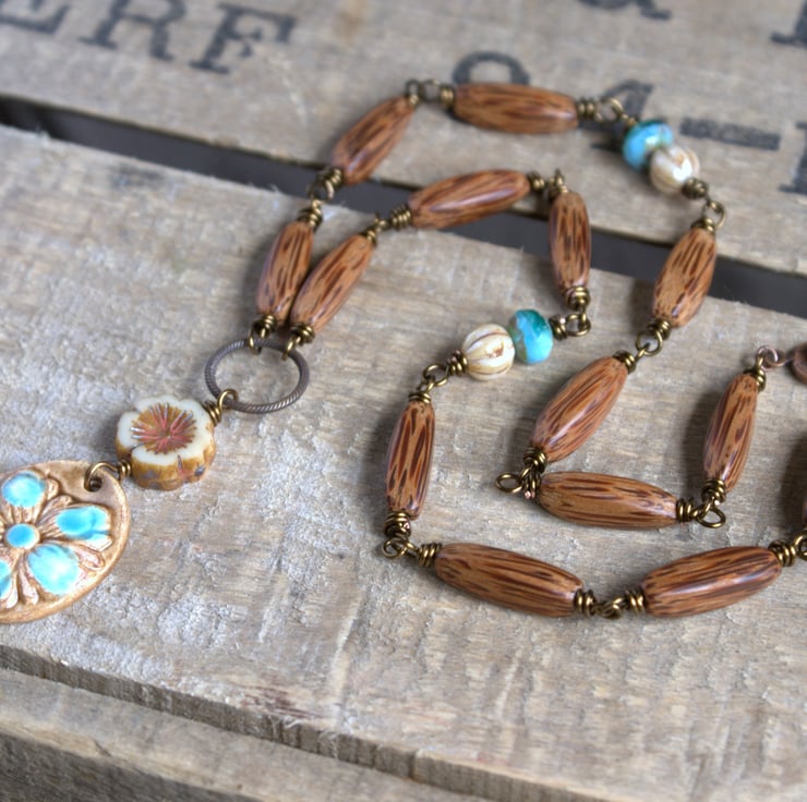 The necklace is finished with rustic Palm wood spindles and Czech glass beads, in matching shades of aqua and cream, which have all been carefully wire wrapped together.