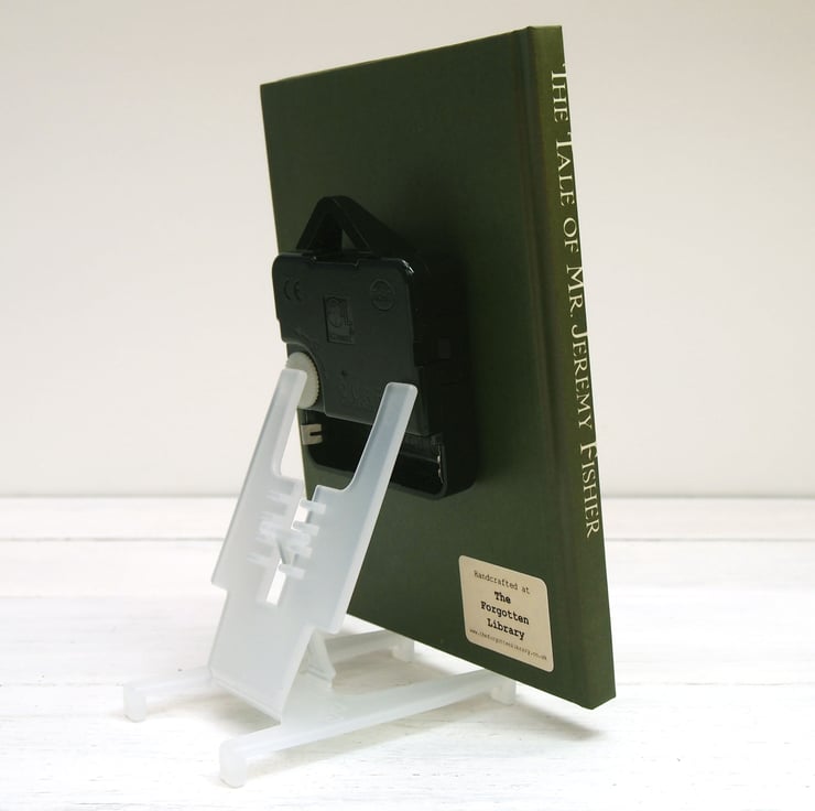 This clock has been created from an original copy of the book The Tale of Mr. Jeremy Fisher by Beatrix Potter. The book has been read and enjoyed by a previous owner so it may show light wear to the cover. This edition has dark green boards and was produced in the 1980s.