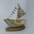 Buttons decorate her bow on the starboard side, and bunting made from a map is attached to the sail, made from a vintage napkin. Sky blue ric-rac adorns the hull of the little sailing boat. She measures 28 cm (10.5") length , 26 cm (10") in height and 11 cm (4.5") in depth.