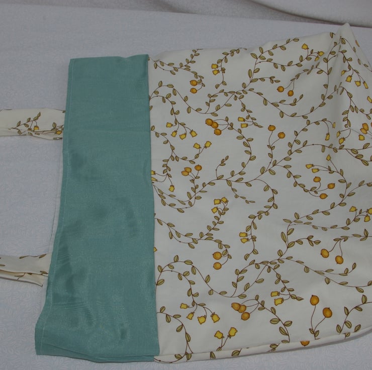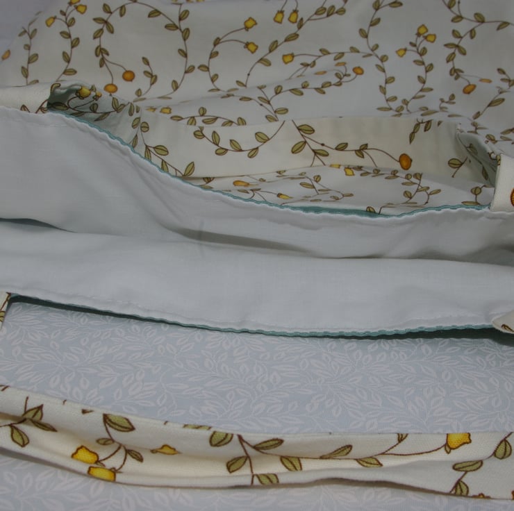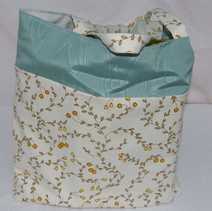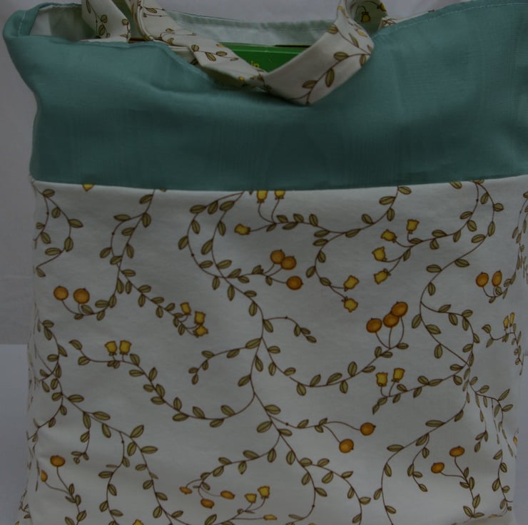A handmade orange and lemon print shopping bag with short hand held handles. This shopping bag has a reinforced bottom of quilted material between the bag and the lining. The bottom part of the bag has been created with 100% cotton fabric with a pattern of oranges and lemons on an off white background. The top part of the bag is created using a piece of vintage green rayon fabric.