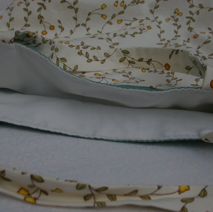 The handles are short handles design to be held in the hand rather than carried on the shoulder. They are created from the same orange and lemon print cotton fabric as the bottom of the bag.