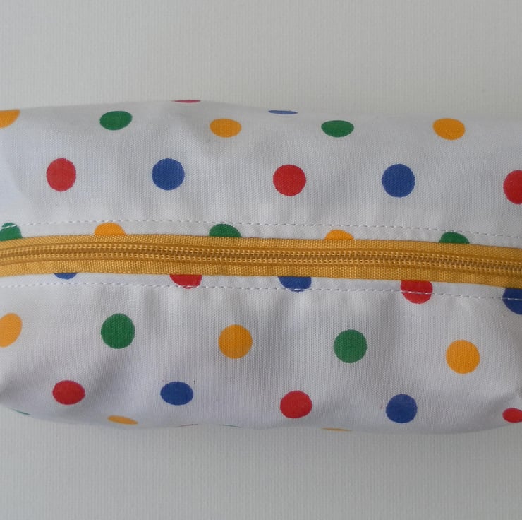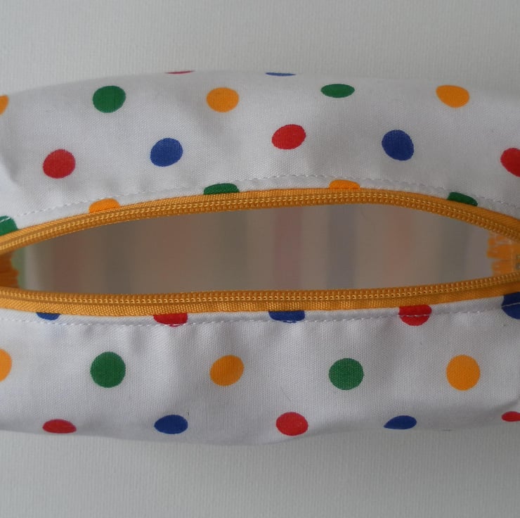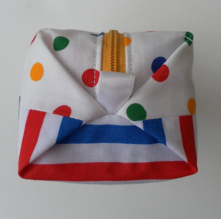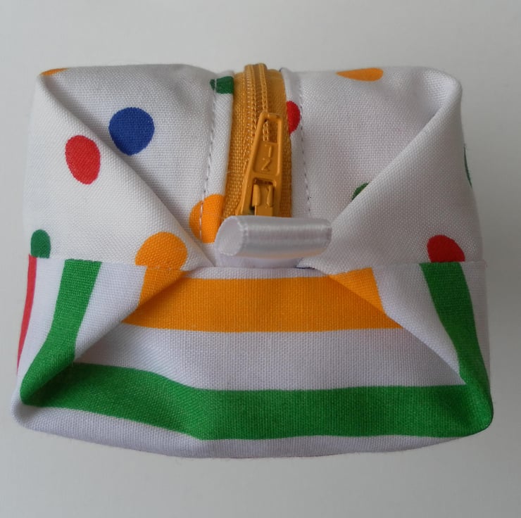 This fun, boxy make up bag is approximately 14cm x 6cm x 7cm. It has a zip and is fully lined.