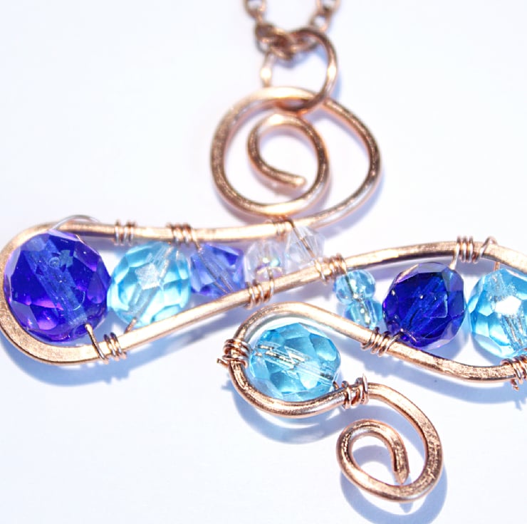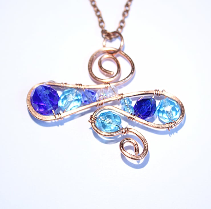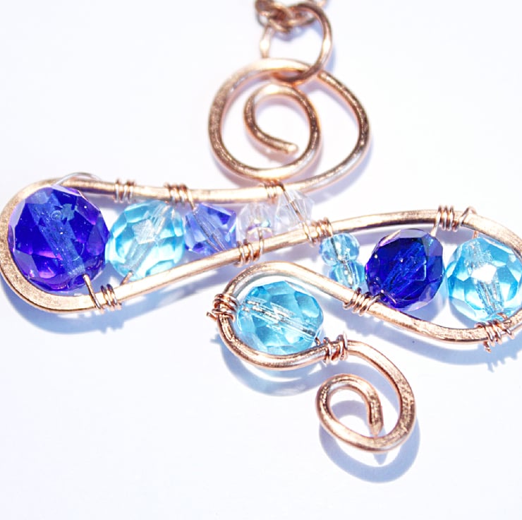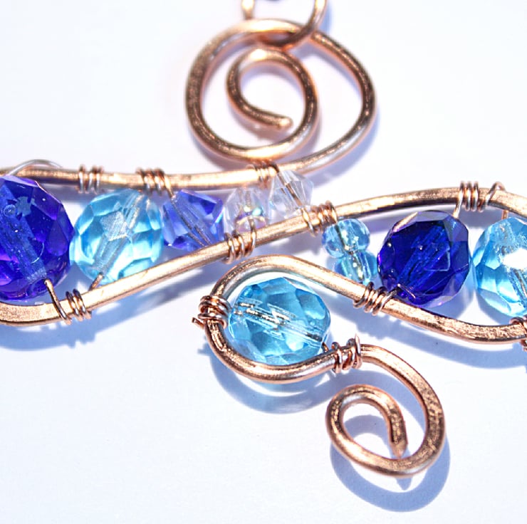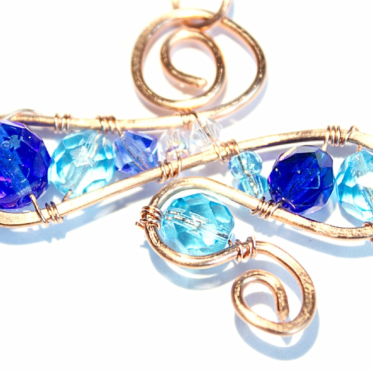OOAK pendant crafted from a selection of faceted glass beads in shades of blue from royal blue through sky blue to palest blue. The pendant is constructed from a continuous loop of non-tarnish copper wire, which has been work hardened by hammering. The beads are wired to the frame.