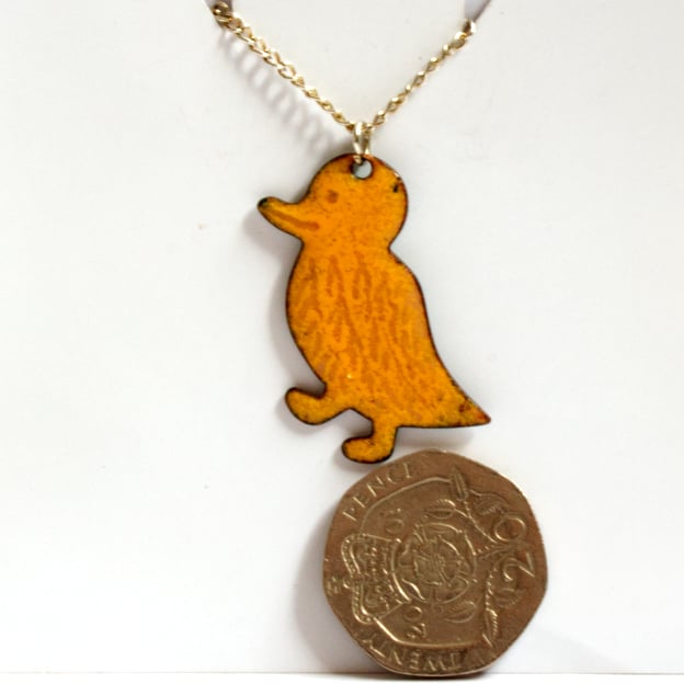 This duck is made in yellow enamel over clear enamel. Its features, eyes, beak and feathers, were drawn into the yellow coat before it was fired and show through, golden-brown, from the copper base.