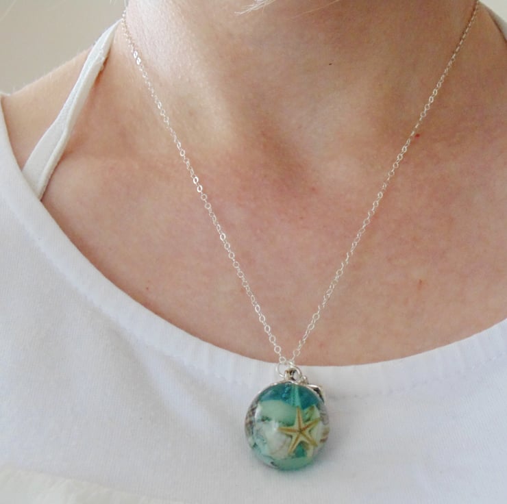 Description: I added these tiny starfish and shells along with some tiny glow in the dark pebbles to UV resistant, non toxic eco friendly pale aqua colour resin, This orb measures approx 20mm I have capped with a pretty ornate silver cab and hung on a pretty 18" 925 sterling silver chain along with a silver plated shell charm. Lovely necklace, so pretty for any lover of nature and the seaside:)