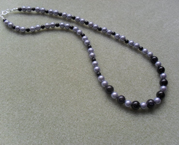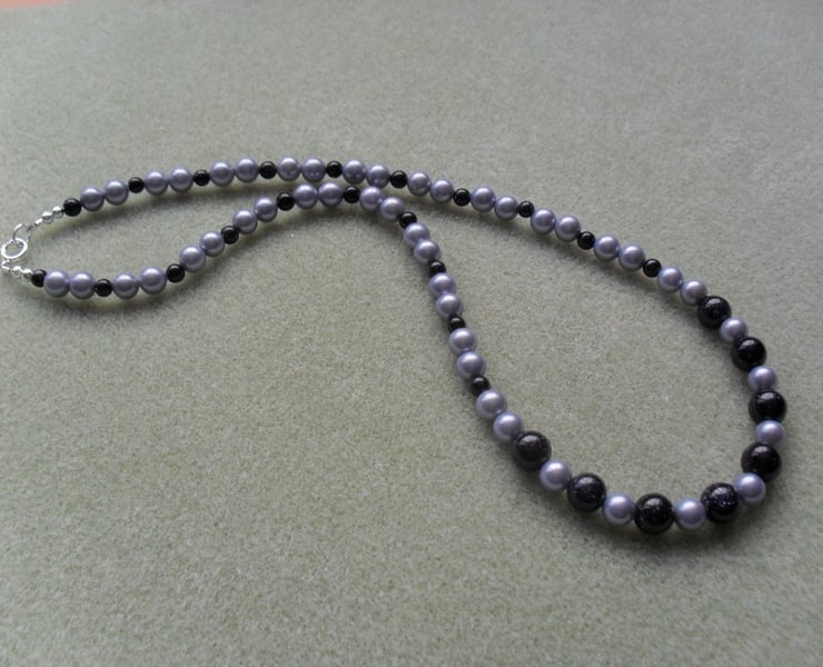 Necklace is made using blue gold stone which is a dark navy blue colour with a glitter like effect in the light and lilac/blue shell pearl