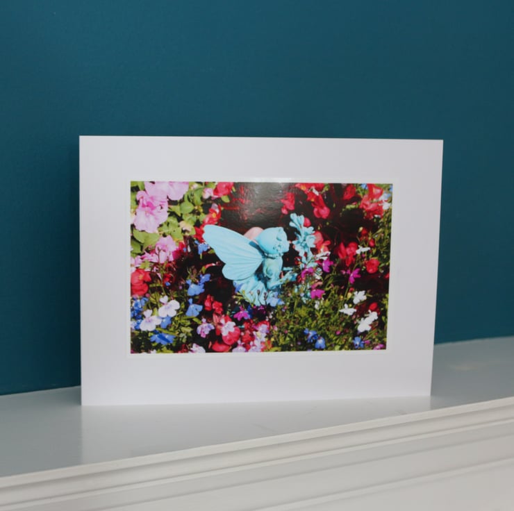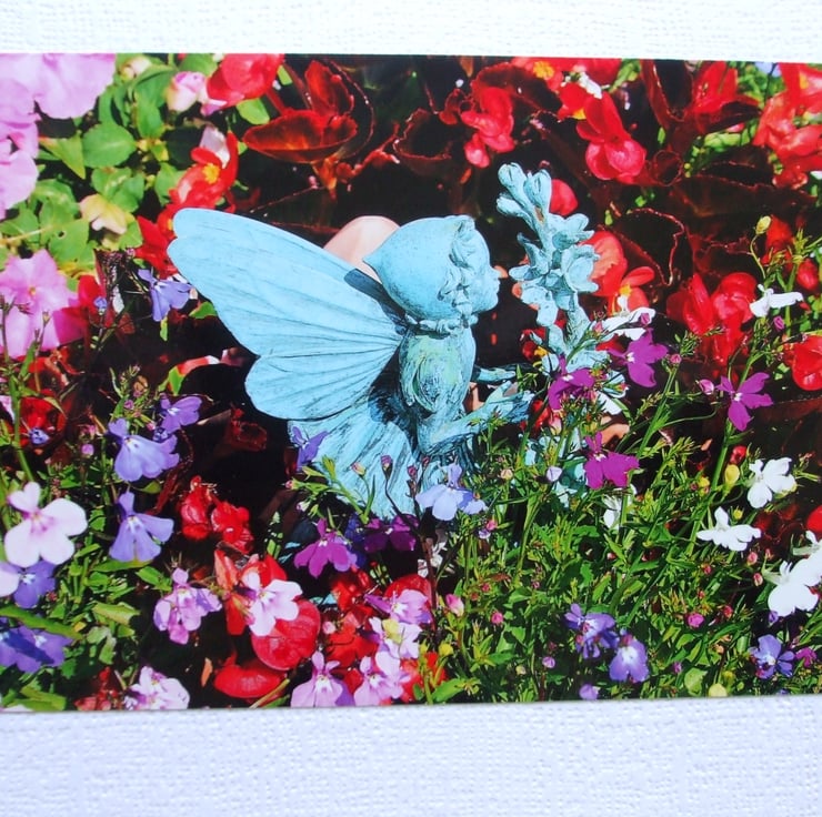 a 6" x 4" photo of our Fairy, smelling the flowers, in our garden; the photo has a narrow white border. The landscape photo is mounted on white textured card, with a blank inner, left plain for your own personal message. An envelope is also included.