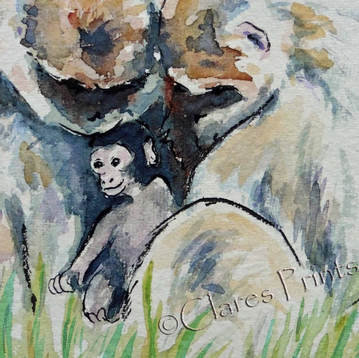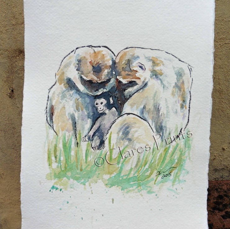Original watercolour and ink painting on acid free 320gsm handmade Khadi Indian watercolour paper with deckle edges of a mum and dad Macaque money with their tiny baby!