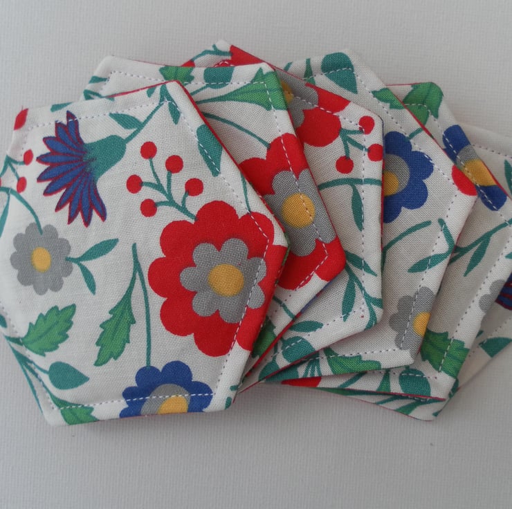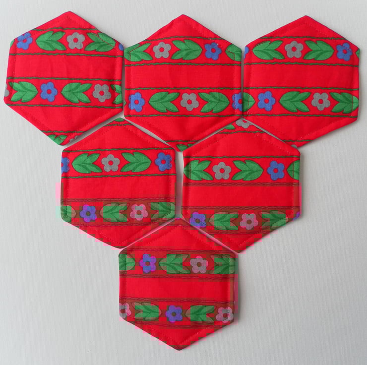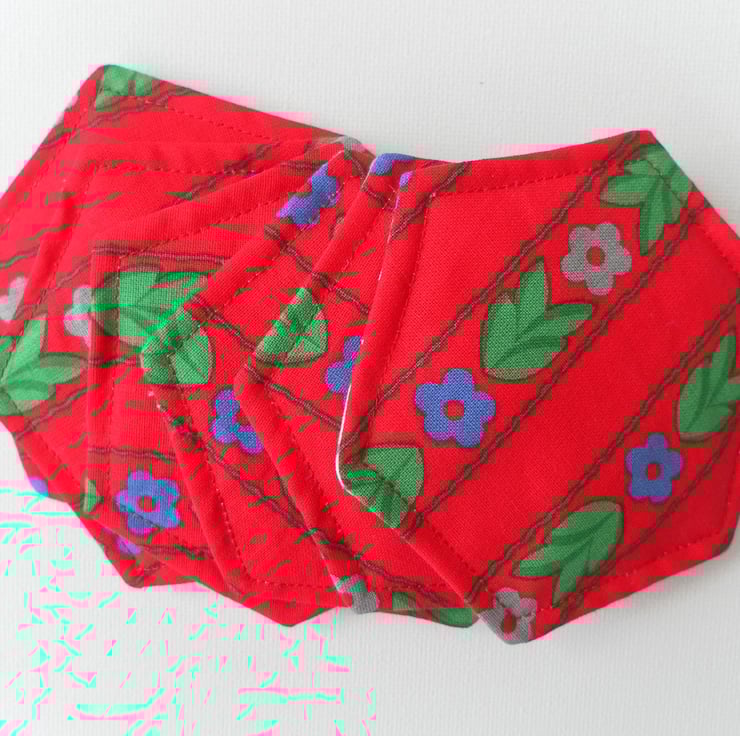 Colourful  Coasters, Set of Six, Hexagonal, Floral, Red