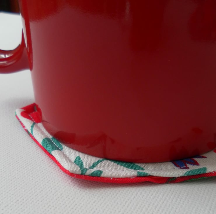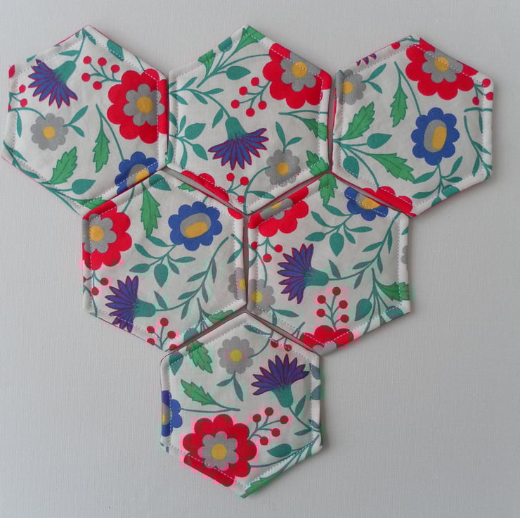 A set of six double sided, lightly padded fabric coasters. Perfect for a splash of colour. These hexagonal coasters measure approximately 10cm across, corner to corner.
