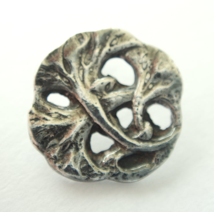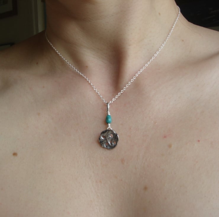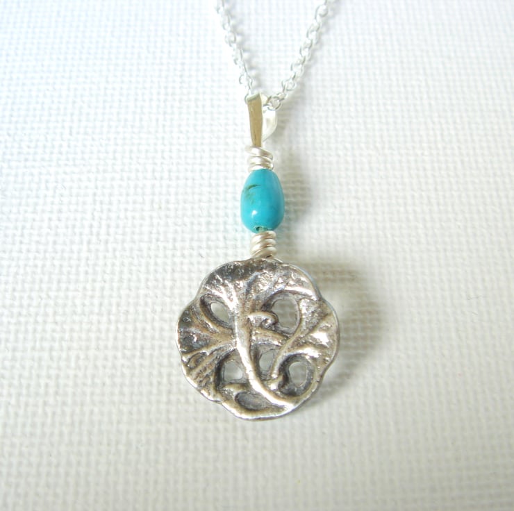 This stylish and distinctive pendant has been hand cast in fine silver from an antique Art Nouveau button depicting the foliage of the Maidenhair Tree or Ginkgo. This is an authentic vintage design and very typical of the period. The silver has been heavily antiqued to bring out the detail. It has been teamed with a high quality semi-precious turquoise bead, which is the December birthstone, and mounted on a 450 mm long sterling silver chain. The pendant itself measures just 35 mm 1 3/8" long. All of the silver work in this charming pendant was hand-crafted by me in my West Sussex studio.