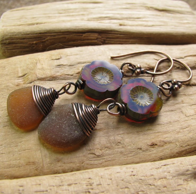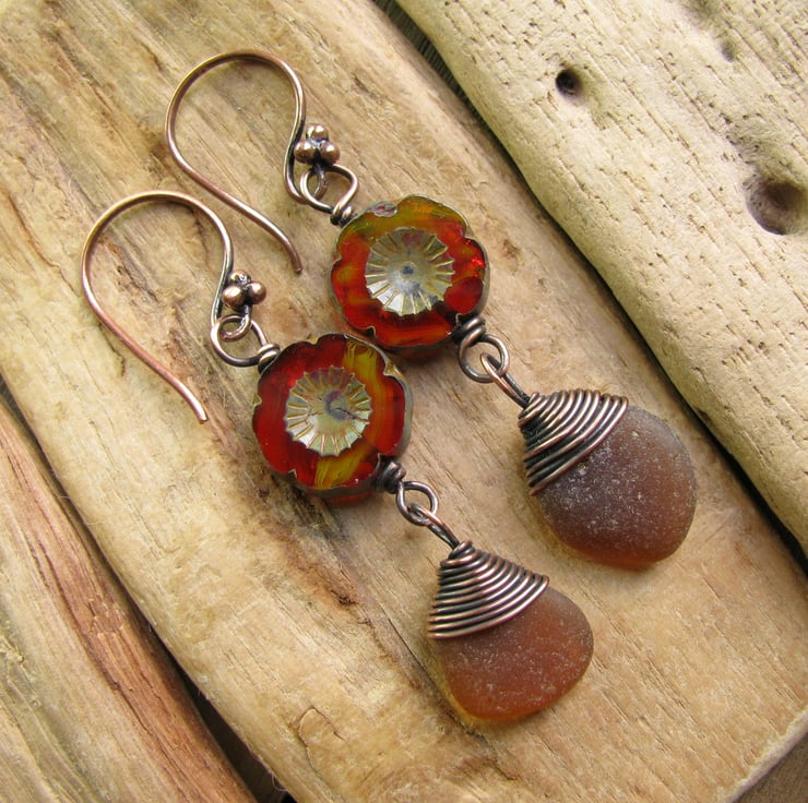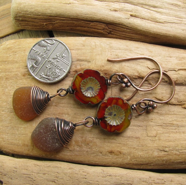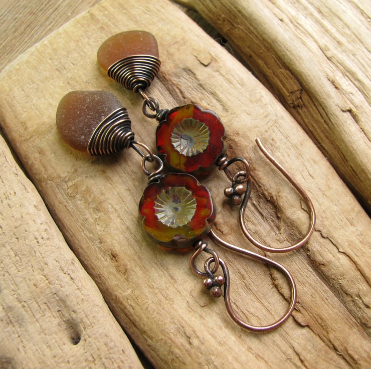A slightly different take on my sea glass earrings. I've added in lovely Czech glass table beads as I think they compliment the sea glass really well. This set of earrings have brown sea glass drops with beautiful red/brown Czech table beads. The sea glass and beads are wrapped with copper wire and given an antique finish. The earring hooks are 1mm thick copper with little bali style additions to the hooks.