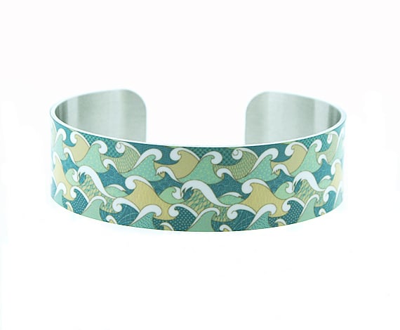 A narrow cuff bracelet with an ocean waves design, made from 90% recycled aluminium. Handcrafted jewellery, made in the UK, and an deal gift for someone who loves the sea.