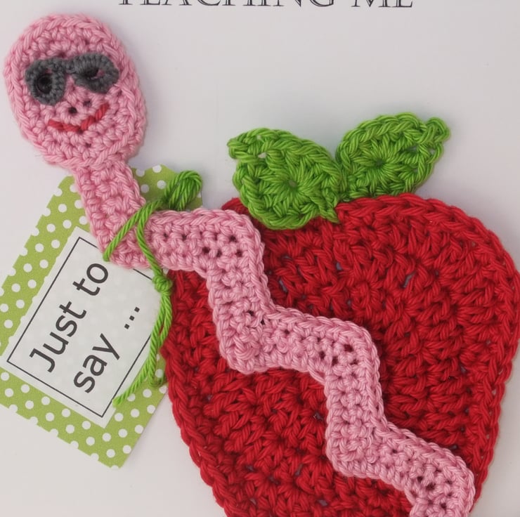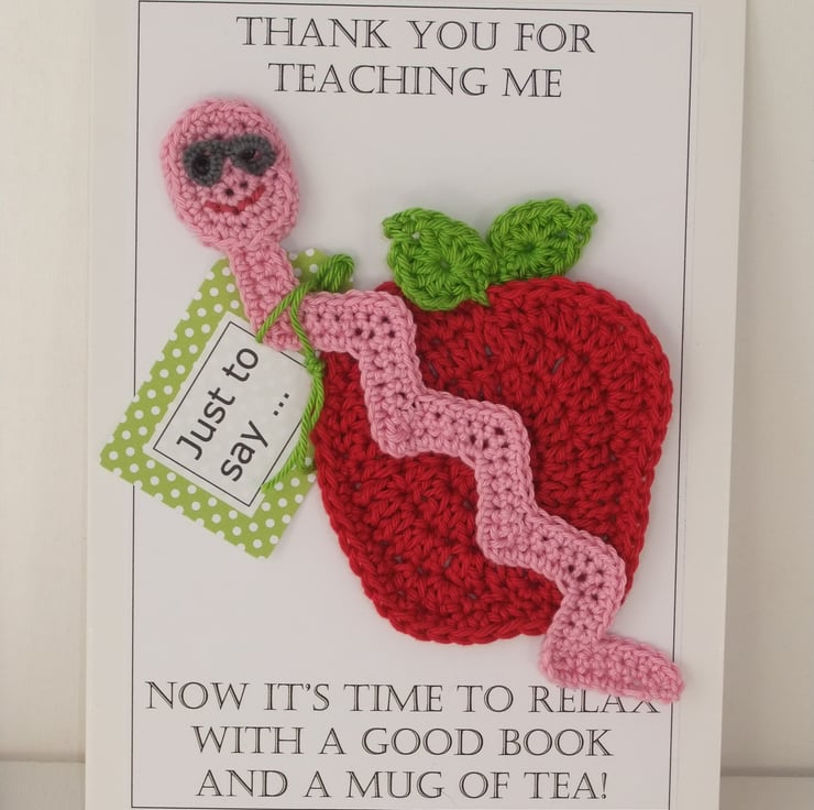 A special way to thank a special teacher! The bookworm bookmark and apple mug coaster are crocheted in 100% cotton and have been stitched to a strong, single piece of A5 card, from which they can easily be removed when required. The greeting on the front of the card reads: ‘Thank you for teaching me. Now it’s time to relax with a good book and a mug of tea!’ The ‘Just to say …’ gift tag (from https://folksy.com/shops/StephShortSupplies) provides space for a greeting and a longer message could be added to the back of the card (between the stitches holding the keepsakes in place) or included separately in the presentation box.