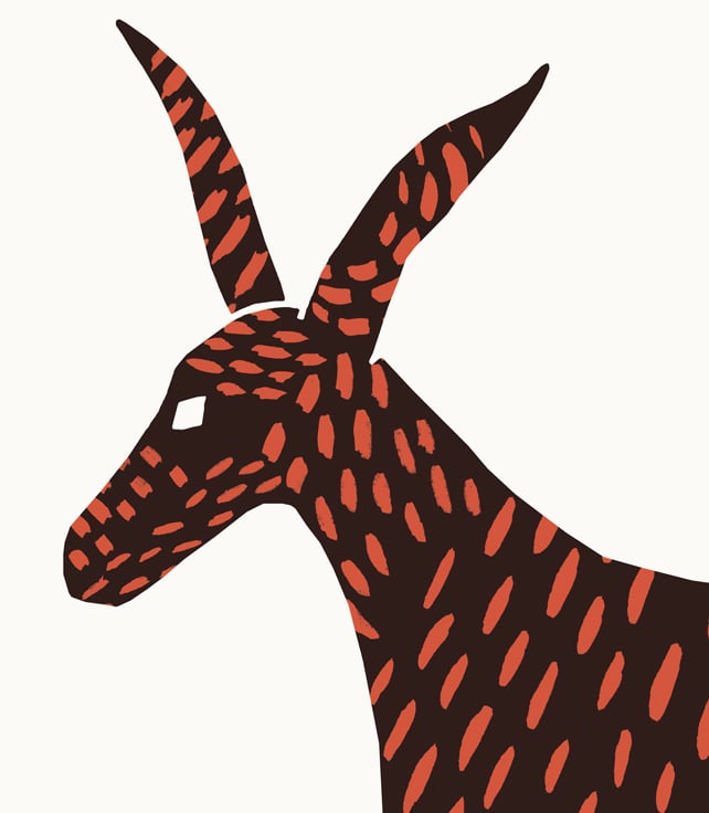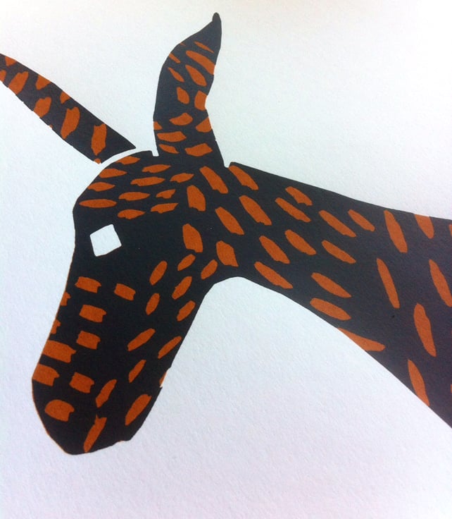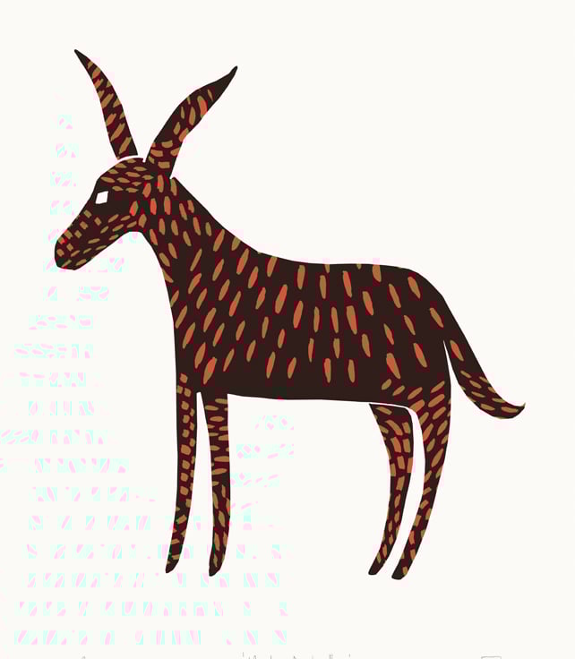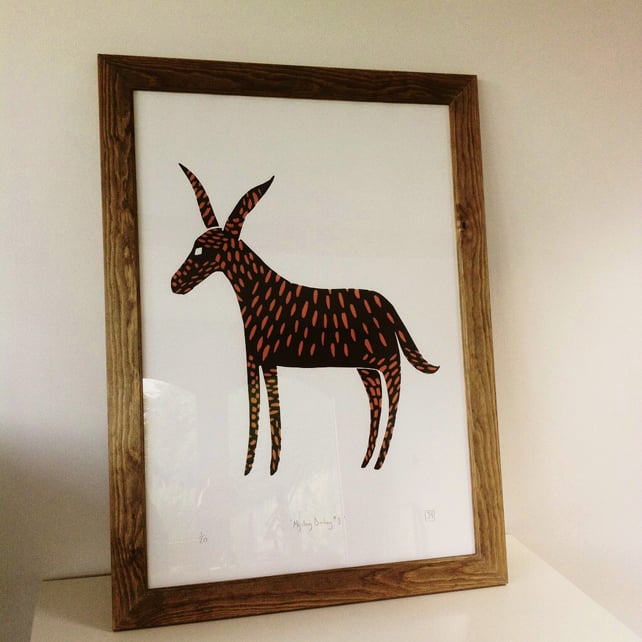 This is a screen print entitled 'Mystery Donkey No.1' printed in grey and orange.