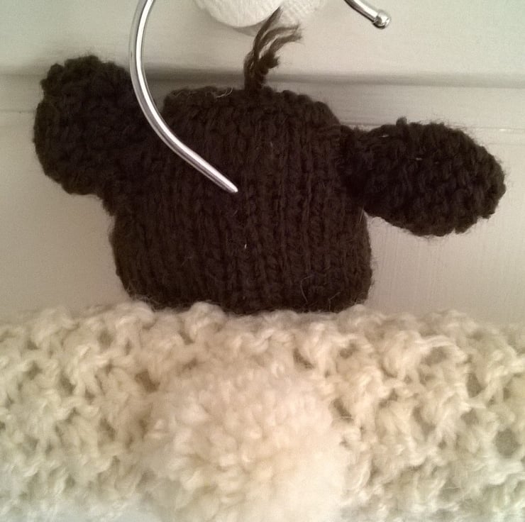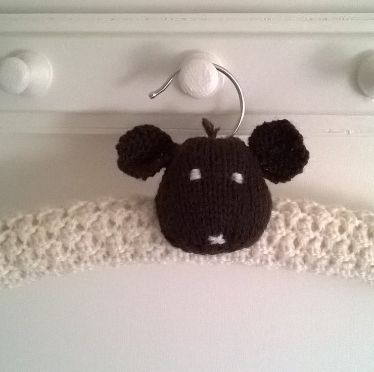 A cheeky little hand knitted woolly sheep coat hanger. The wooden base is wrapped in wadding, with a cream knobbly textured knitted cover, the metal hook pops out the top of the head of the rascaliest face in the flock! He has a little fluffy tail securely sewn to his back.