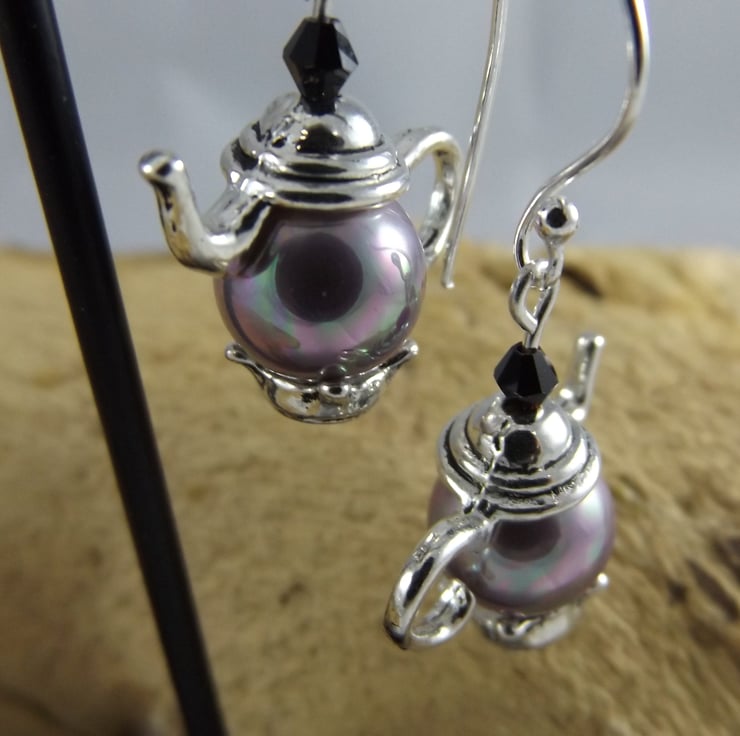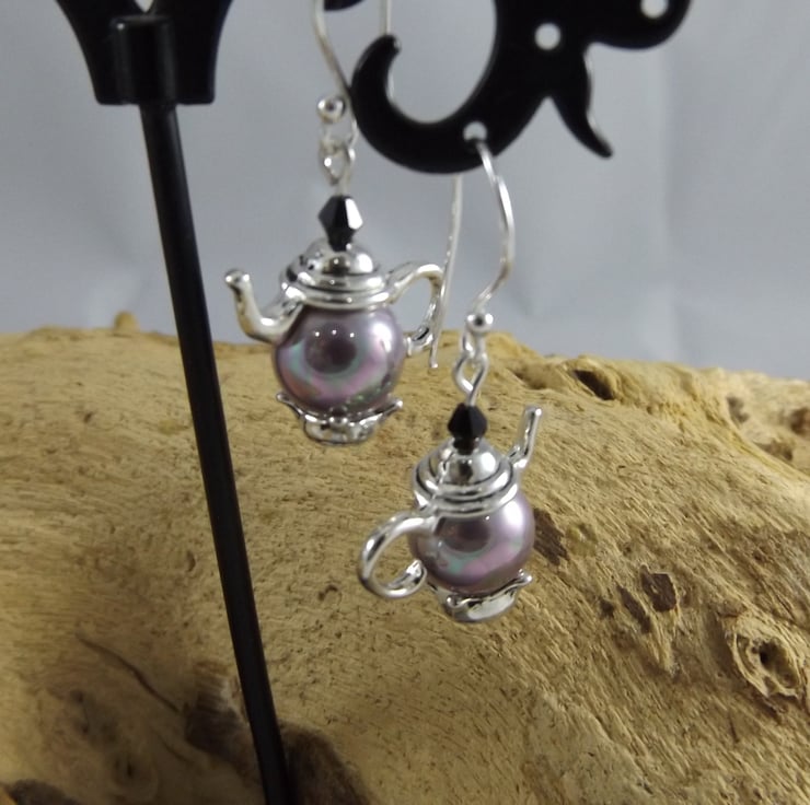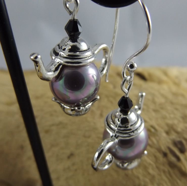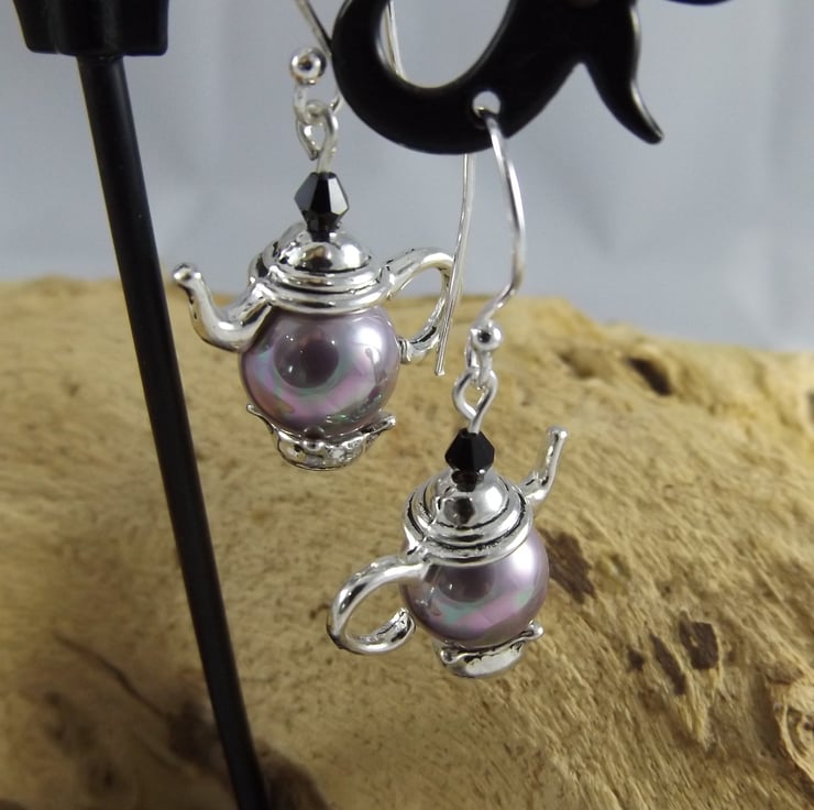 Silver plated teapot charm earrings with lilac shell pearl with ab coating. drop of 2 cm with a black Austrian crystal on lid with shepherd hooks. Will come gift packaged