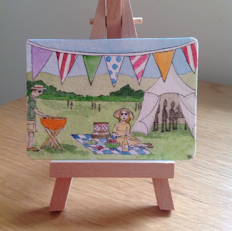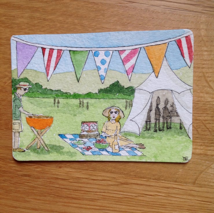 This ACEO is an original watercolour of a picnic at a village fete painted from my own imagination. There's bunting, barbecues, sunny weather and a glorious day on the edge of the village!