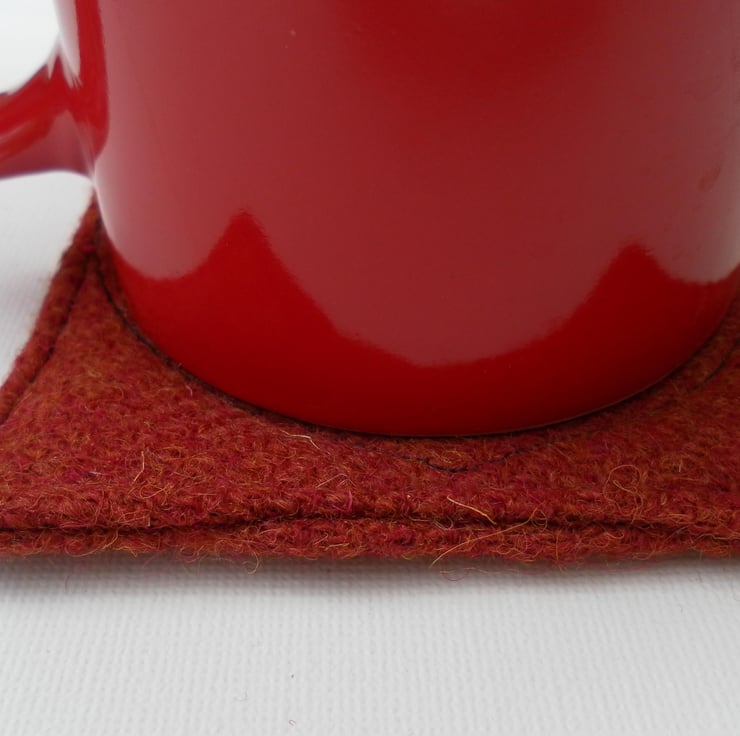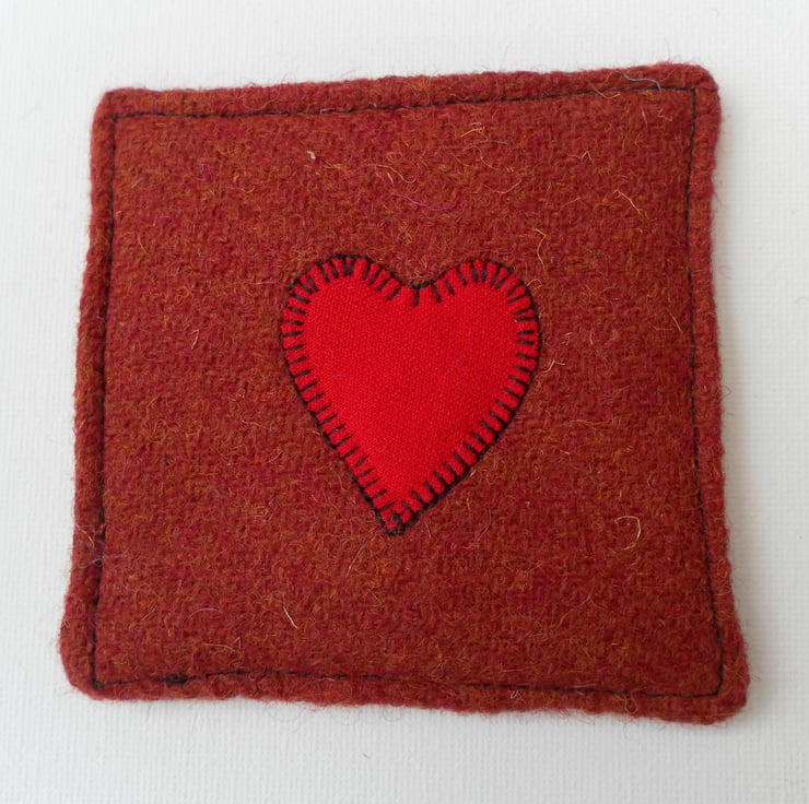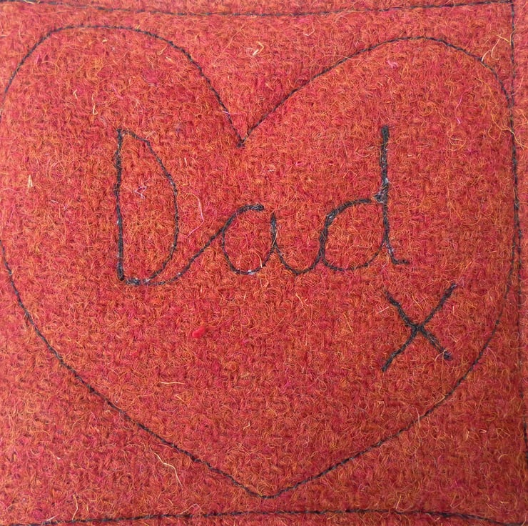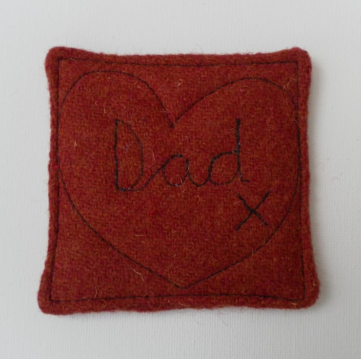 Give dad his own coaster. This coaster is made from a russet brown tweed fabric. It is decorated with a machine embroidered “dad” and an “x” inside a heart. On the reverse there is a red appliquéd heart. The coaster measures approximately 10cm x 10 cm. Although I cannot guarantee it is completely heatproof it is padded with wadding and another layer of tweed.