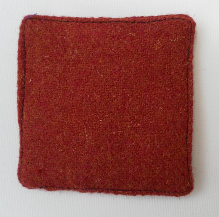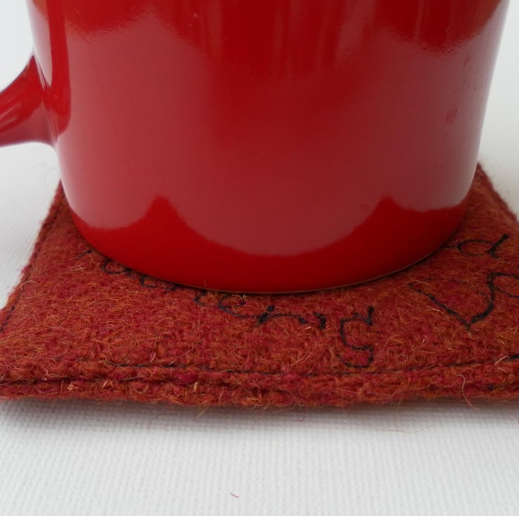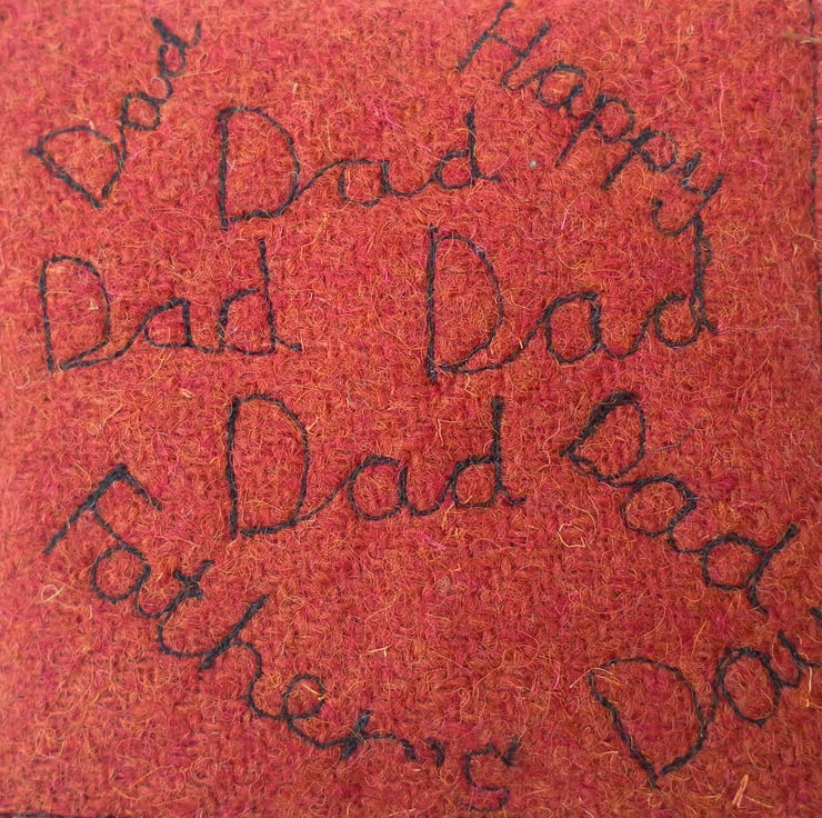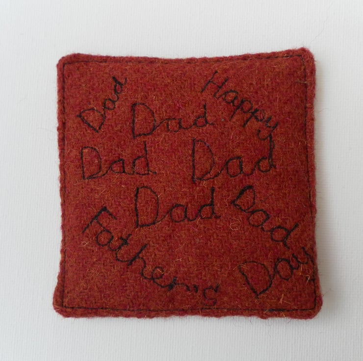 Give dad his own coaster for Father’s Day. This coaster is made from a russet brown tweed fabric. It is decorated with graffiti machine embroidered “dad” and “Happy Father’s Day”. It is plain on the reverse. The coaster measures approximately 10cm x 10 cm. Although I cannot guarantee it is heatproof it is padded with wadding and another layer of tweed.