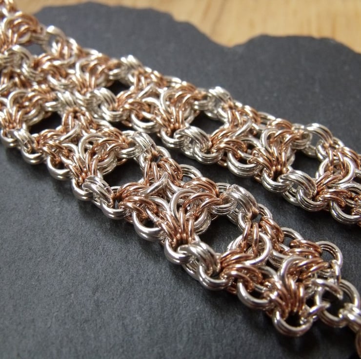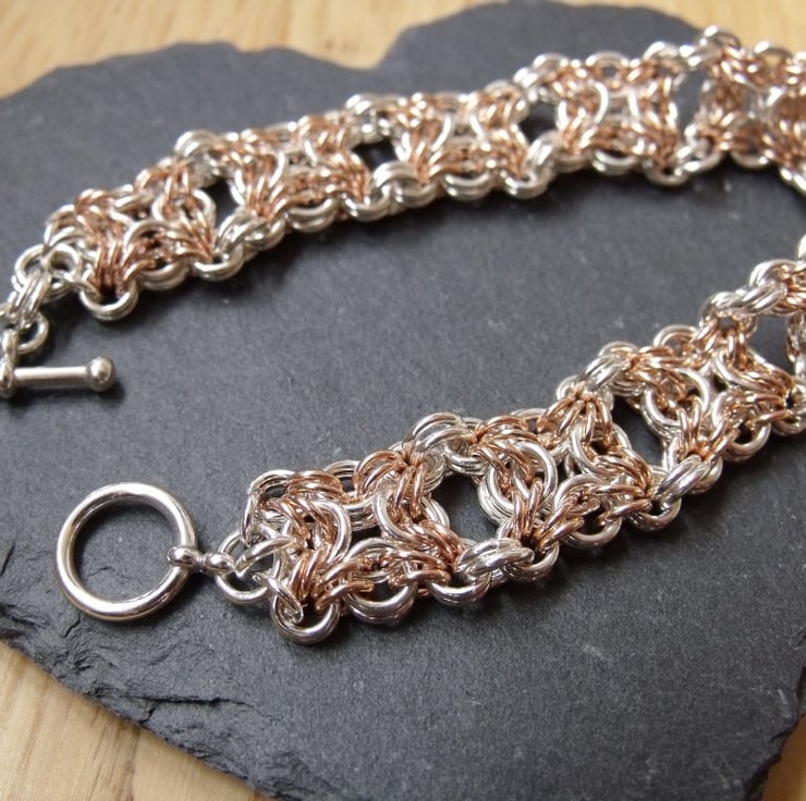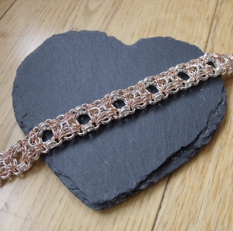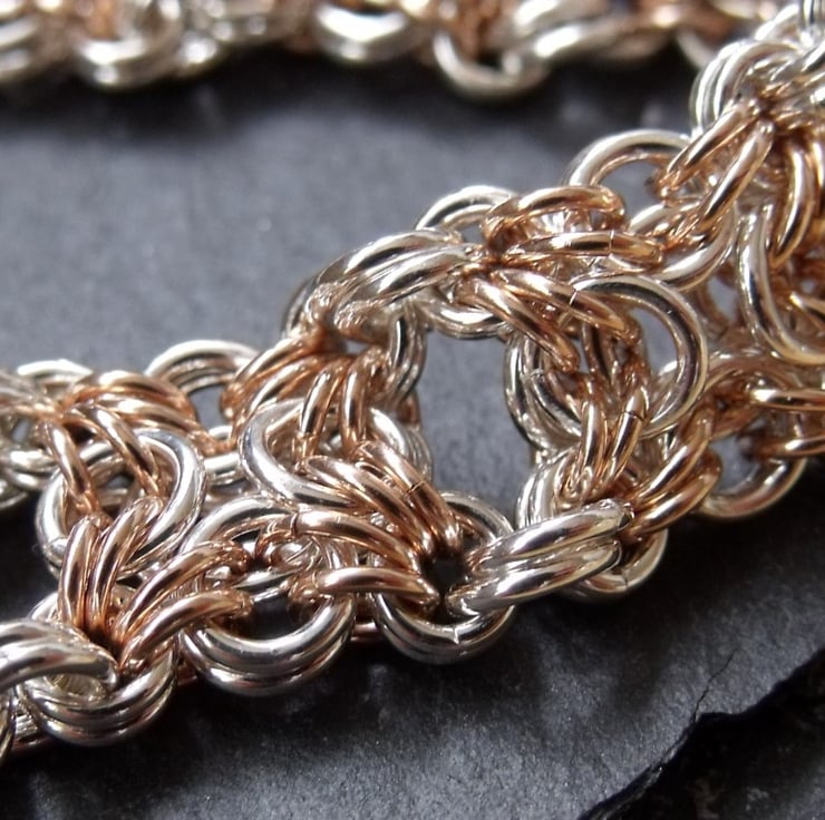 I make individual jump rings myself and then weave them together in a style of jewellery known as chainmaille. In this design, jump rings are woven together in sections, in the style of Celtic Knotwork and then joined together. The overall effect is a very pretty and nicely weighted bracelet. The contrast of the silver and rose gold colours really highlights the intricacy of the design.