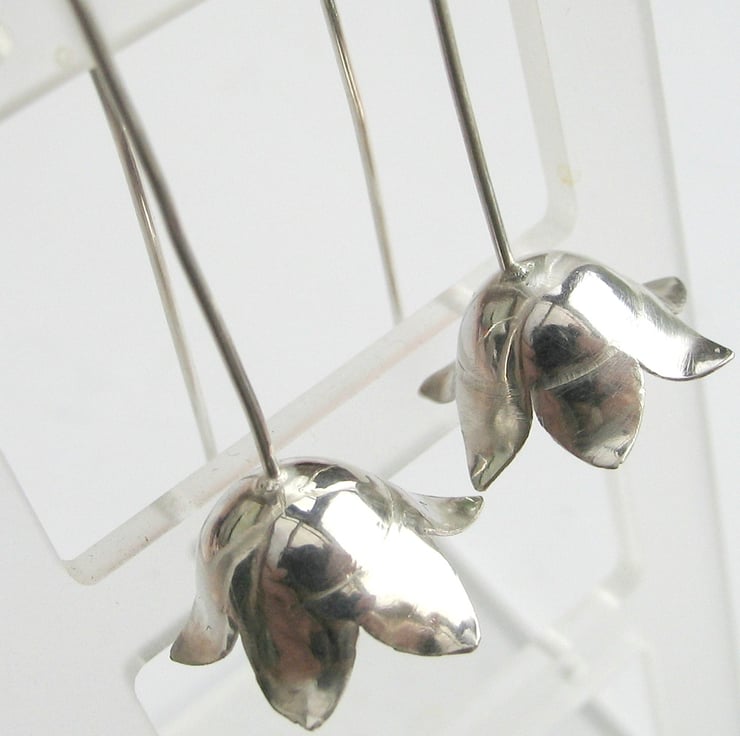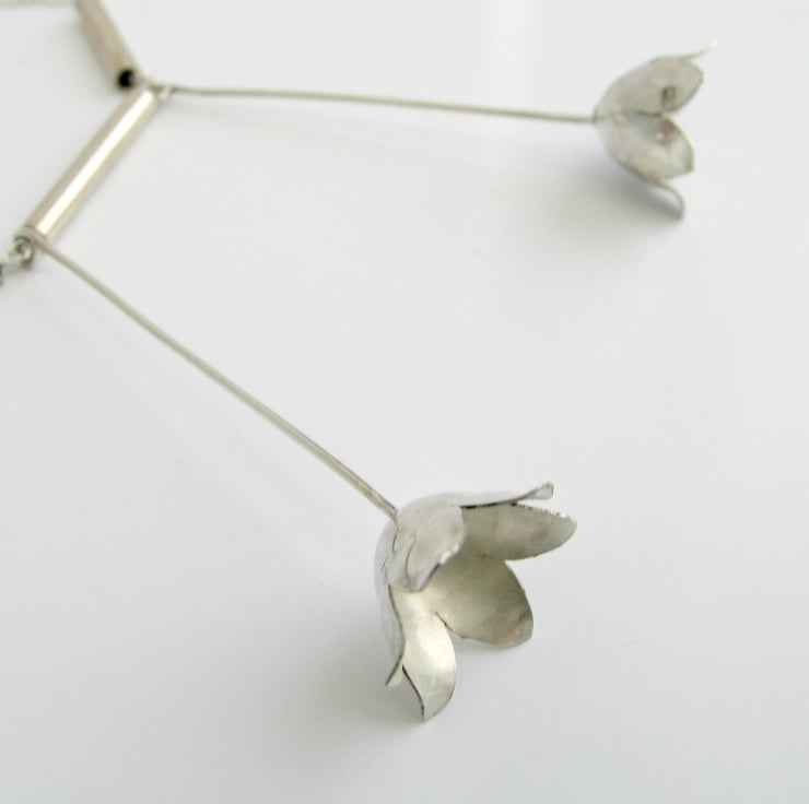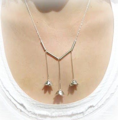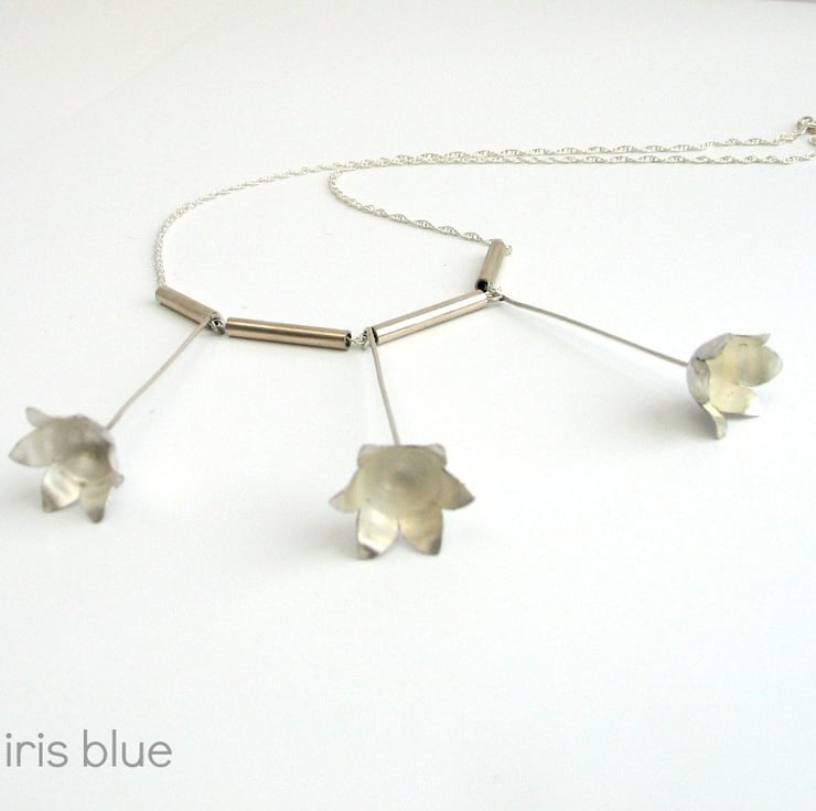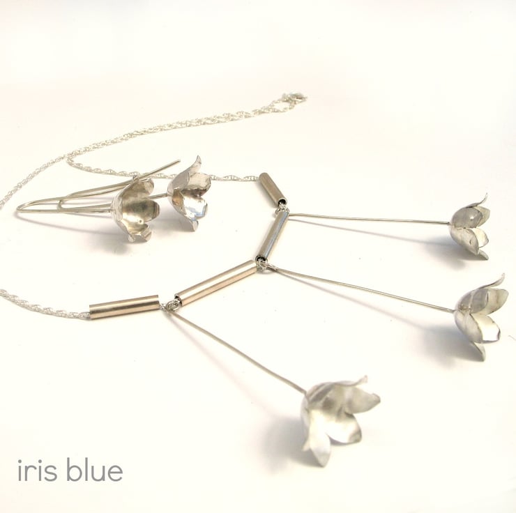 The earrings have a feature style long back which is very on trend, they are mirrored in the necklace which has three of the flowers hanging between sterling silver tubes.
