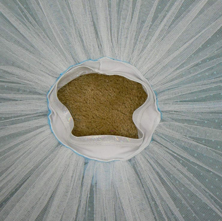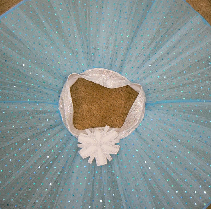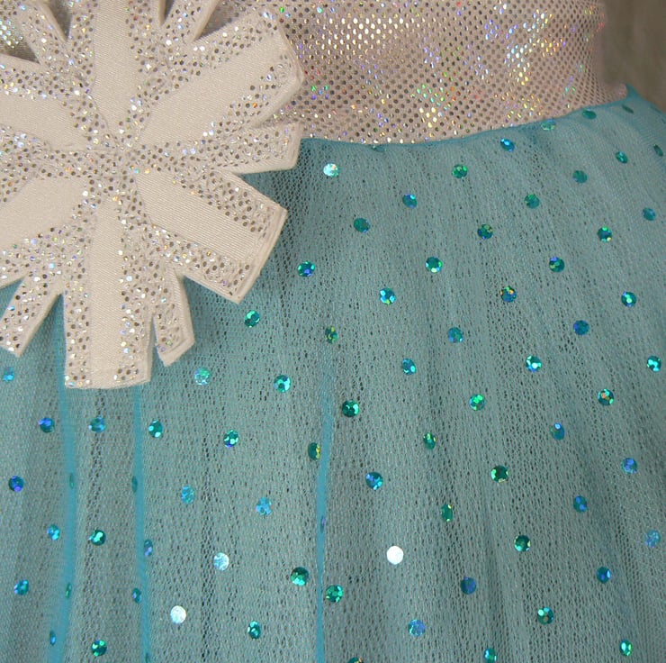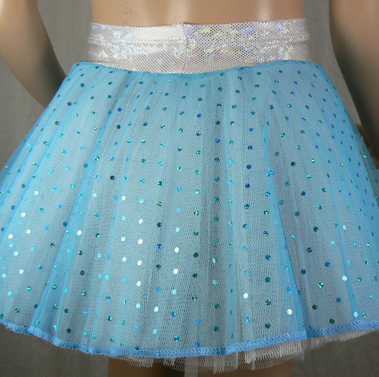 This little pull on skirt has a sparkly hologram Lycra waist band and fine soft mesh skirt that has turquoise hologram sequins all over it. It has two layers of white net underneath to give it some body and is finished off with a white and silver snowflake on the waistband.