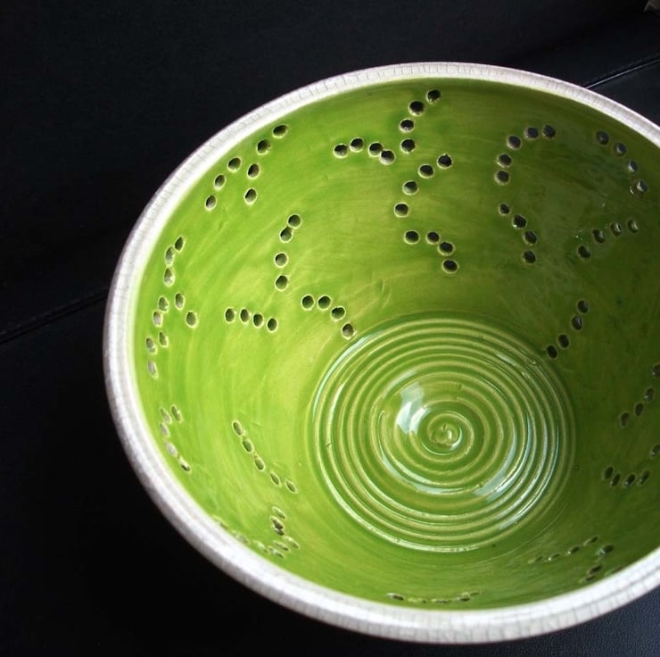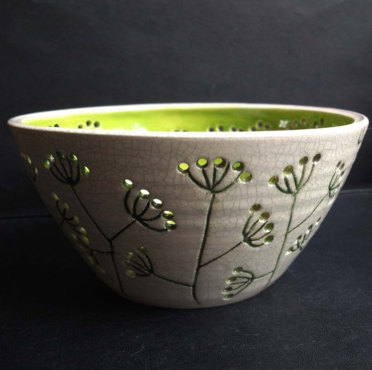 This ceramic bowl has been hand thrown from white earthenware clay. It is finished on the outside with a crackle glaze and on the inside with a bright, glossy glaze.